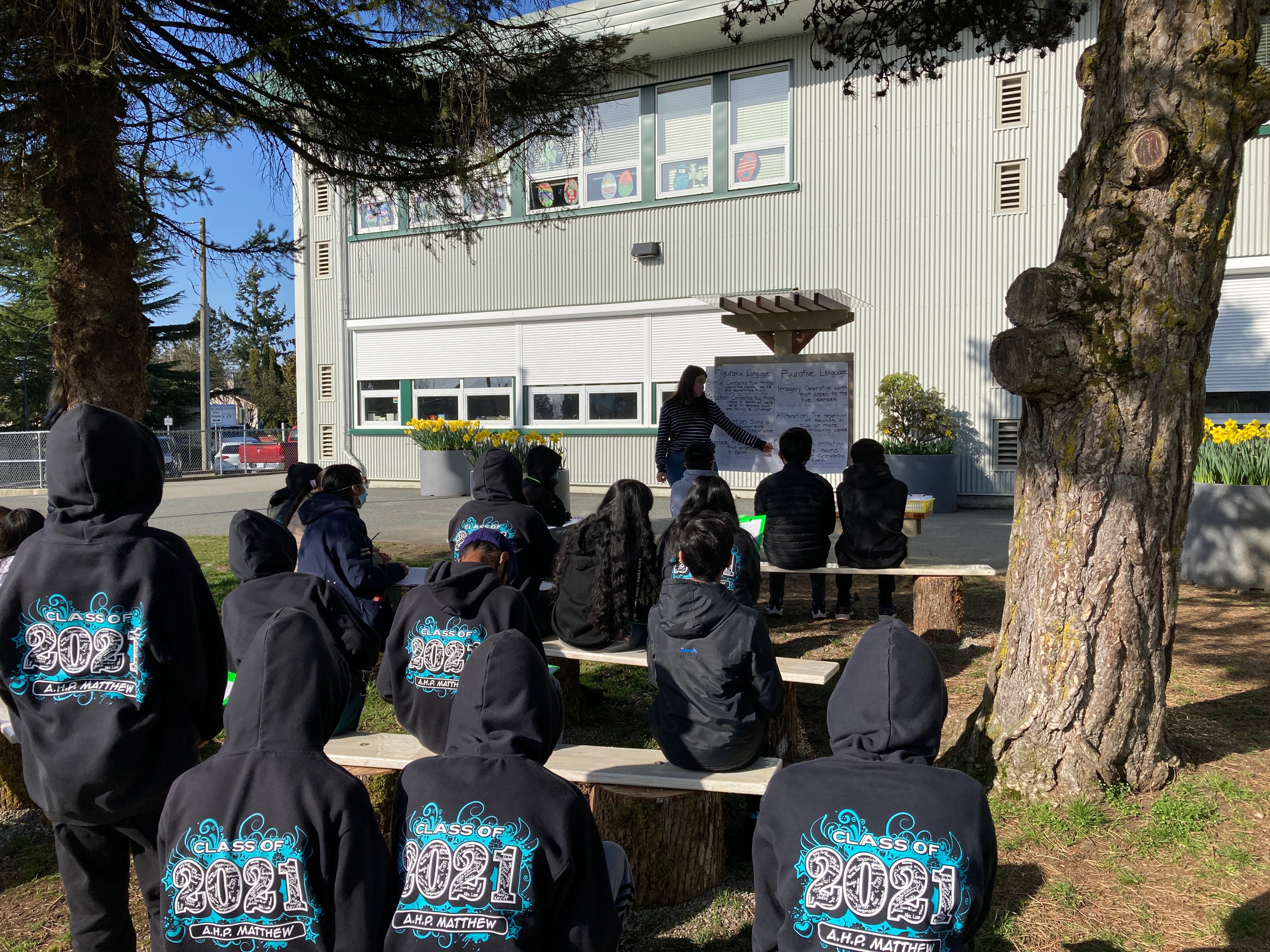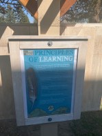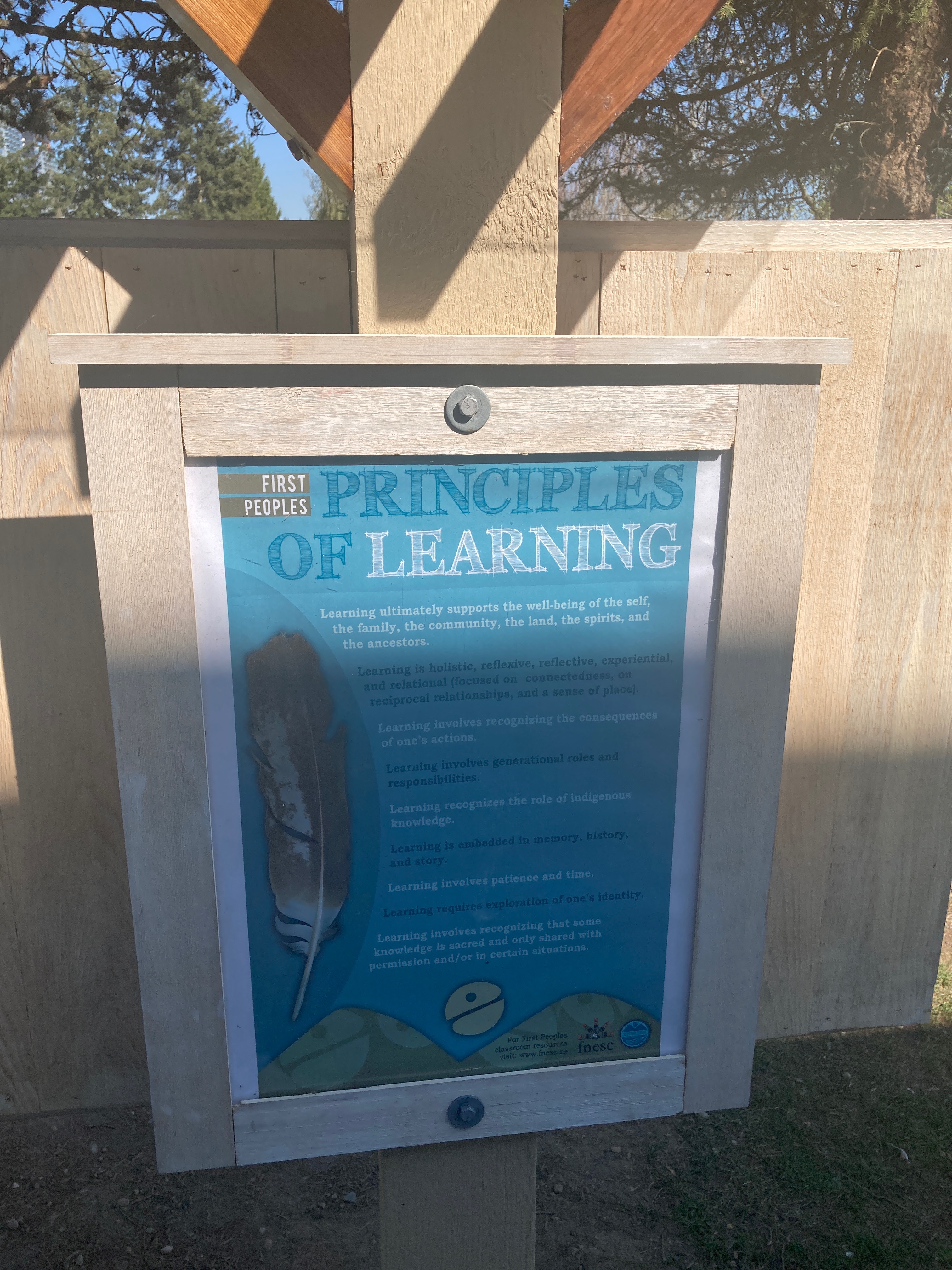 We knew from examining our learners, that they live in a densely Our newly constructed Outdoor Classroom with the First People's Principles of Learning Mountedurban area, and many do not have access to outdoor experiences. We also found that Indigenous learning was only being taught in specific grades, and was focussed on content rather than world-views and ways of knowing. After conducting our initial research, and many passionate discussions, we determined that the path forward would include two essential elements. We would build an outdoor classroom space centred on the First Nations Principles of Learning, as well as develop an accompanying curriculum that focused on Indigenous content as well as Aboriginal ways of knowing, (experiential, hands-on, place-based, oral, storytelling, inter-generational). Our application was approved, and construction of our classroom began. During this time, we continued researching authentic teaching resources to ensure Indigenous voices were represented. We also worked collaboratively with the Aboriginal Education Department Helping Teachers to curate and develop place-based Indigenous curriculum. We then shared out our learning by hosting a Professional Development Day.