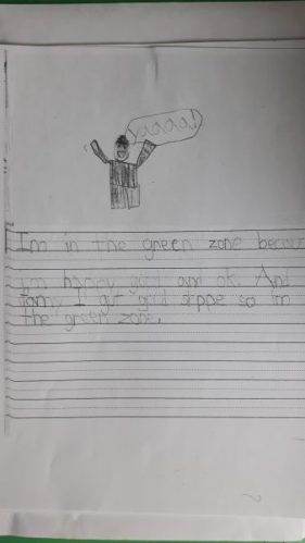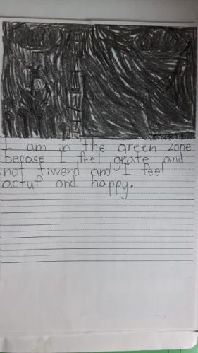 Grade 2 students wrote regular journal entries describing what “zone” they were in at that moment and what strategies they might use to regulate to the green zone in order to be more ready for learning.