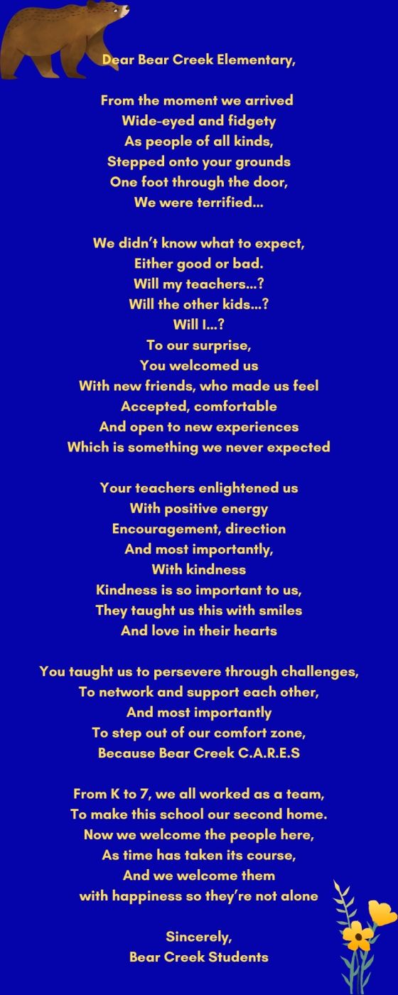 We take pride in our students’ strengths and their ability to support each other in achieving their personal and academic successes. At Bear Creek, our students strive to be compassionate, accountable, respectful, empathetic and safe.