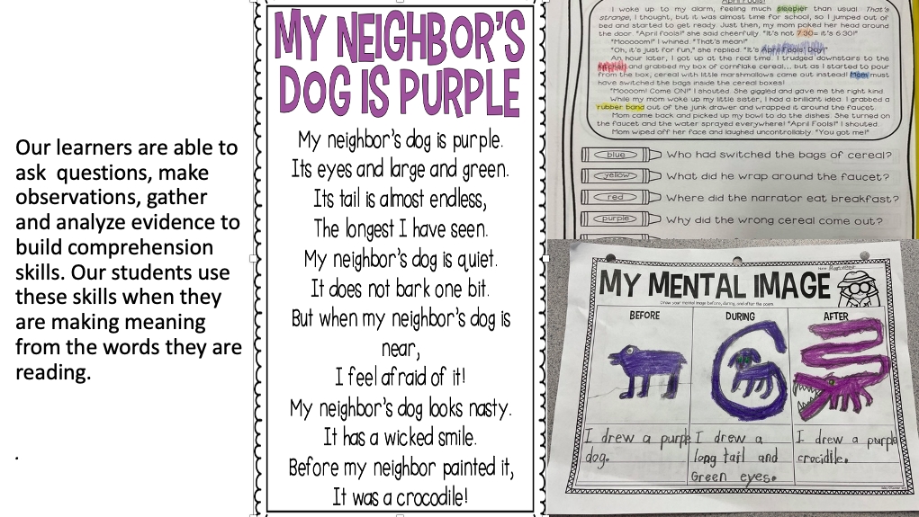My Mental Image: In this activity students are working towards developing their visualizing skills. The students are shown the poem “My Neighbor’s Dog is Purple” and they draw a picture of their mental image before, during, and after reading the poem. As the students read more of the poem their mental image changes based on the new information they receive. Visualizing is an important skill for students to learn when developing their comprehension skills as it helps students create a mental imagine in their mind that represents the ideas in the text they are reading.