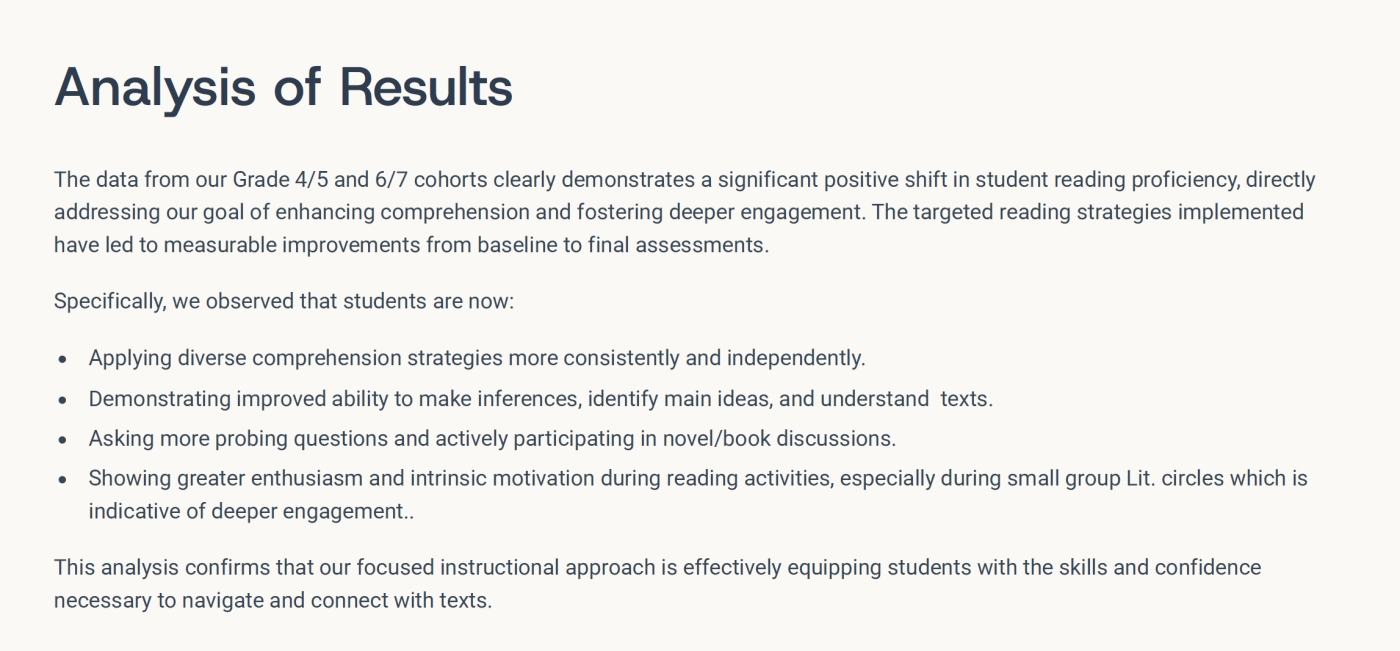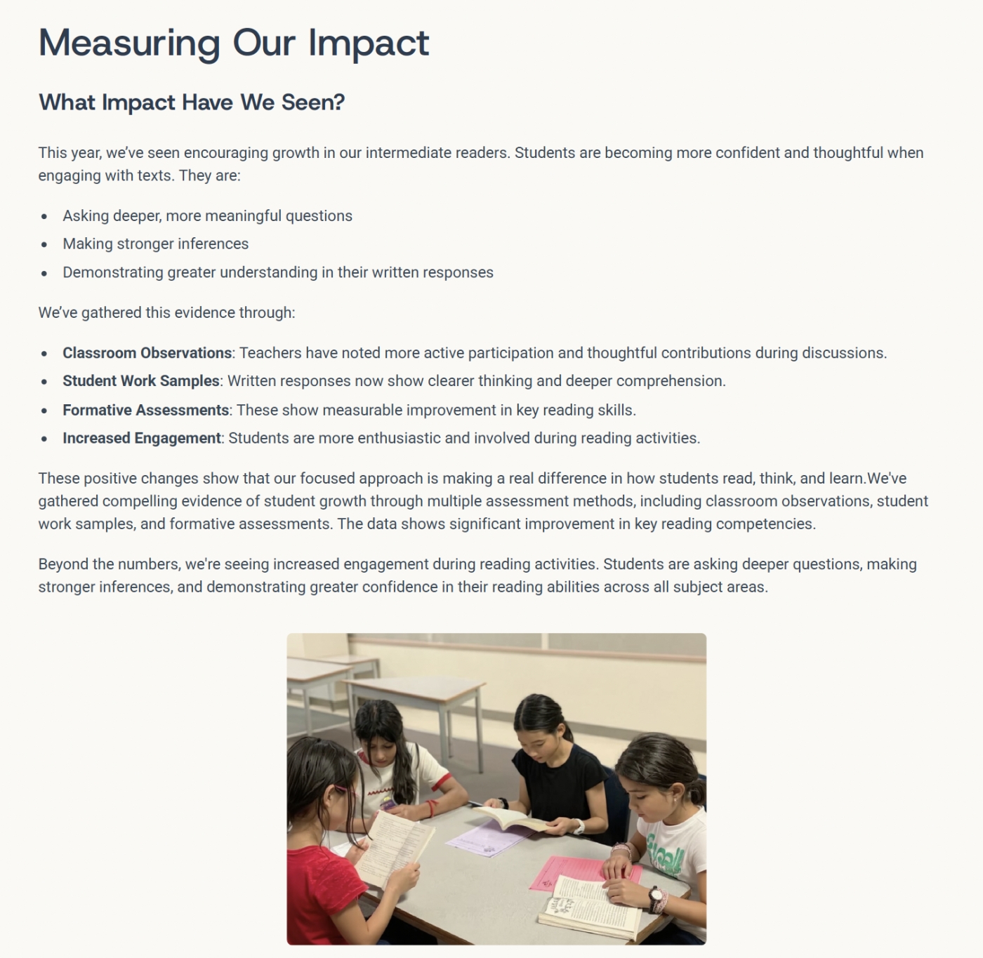 Our learners are developing their literacy skills in meaningful and engaging ways. They are learning to visualize, question, and infer as they read, which helps deepen their understanding and express their thinking with clarity and creativity. Whether through story workshops, hands-on learning, or collaborative conversations, our students are finding their voices and sharing their ideas with confidence.