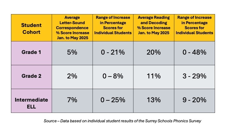 Using the Surrey Schools Phonics Survey for collecting assessment data, the data collected (see table and graph below) indicates that students' overall progress in literacy improved significantly over the year. Students in all three cohorts demonstrated an improvement in letter-sound correspondence and in reading and decoding skills. These two sets of skills are key skills for building reading comprehension. Teachers employed targeted reading strategies and interventions to support students in developing their literacy skills, addressing areas of need identified through ongoing assessment. By utilizing current and up-to-date learning resources aligned with evidence-based instructional strategies, teachers were able to provide targeted and differentiated instruction tailored to the specific needs of each student. These resources proved invaluable in supporting teachers' efforts to foster literacy growth and ensure that all students were equipped with the skills and confidence to succeed as readers and writers.
