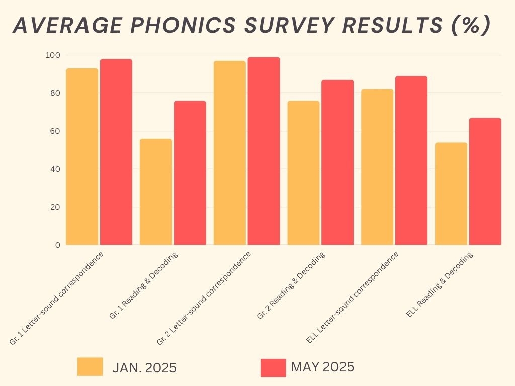 In the 2023–2024 school year, our early primary teachers used up-to-date teaching resources aligned with the science of reading to support the school learning plan’s focus on literacy. These resources were carefully selected to provide evidence-based literacy instruction to our Grade 1 and 2 students. Data collected during that year clearly demonstrated increased student achievement in literacy, particularly in decoding and comprehension skills.