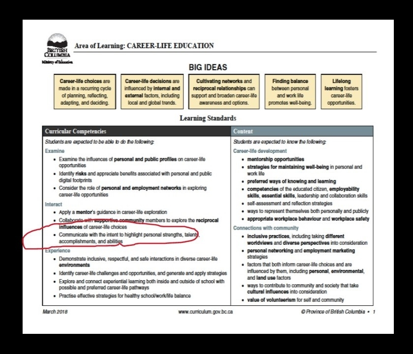 Career Life Education 10 encourages students to develop their self awareness and self management. Exploring their own personal characteristics, interests, motivations, and personality, no matter how difficult this can be, is a very important and healing step that helps move students along the journey of becoming their best self.
