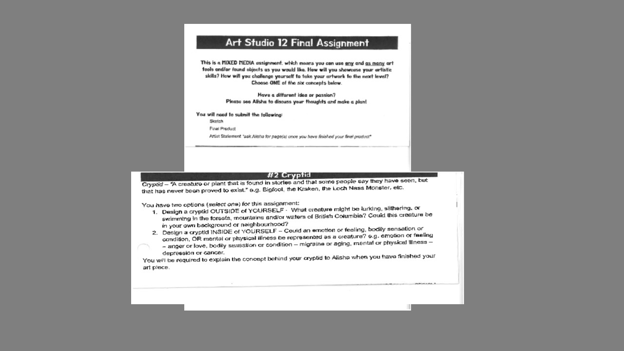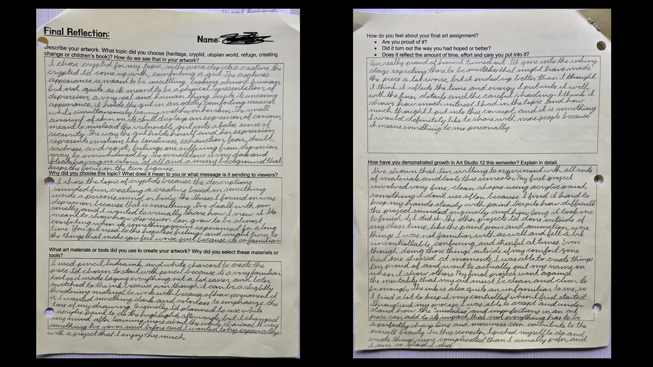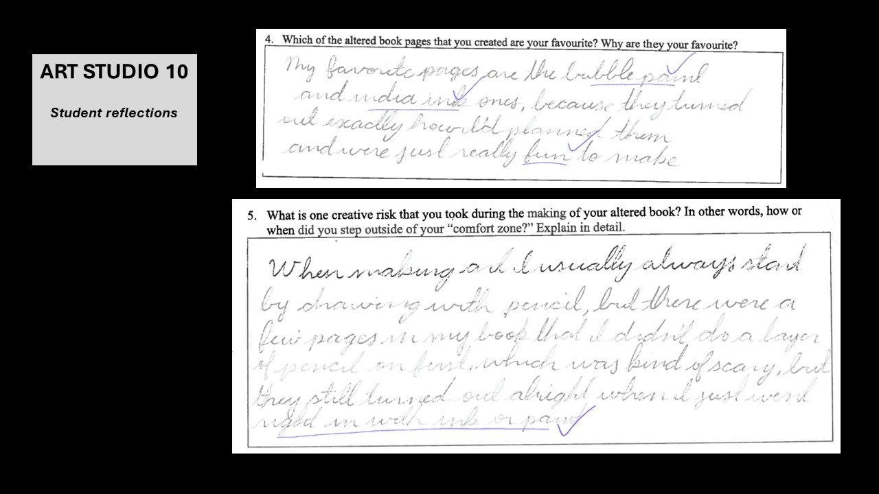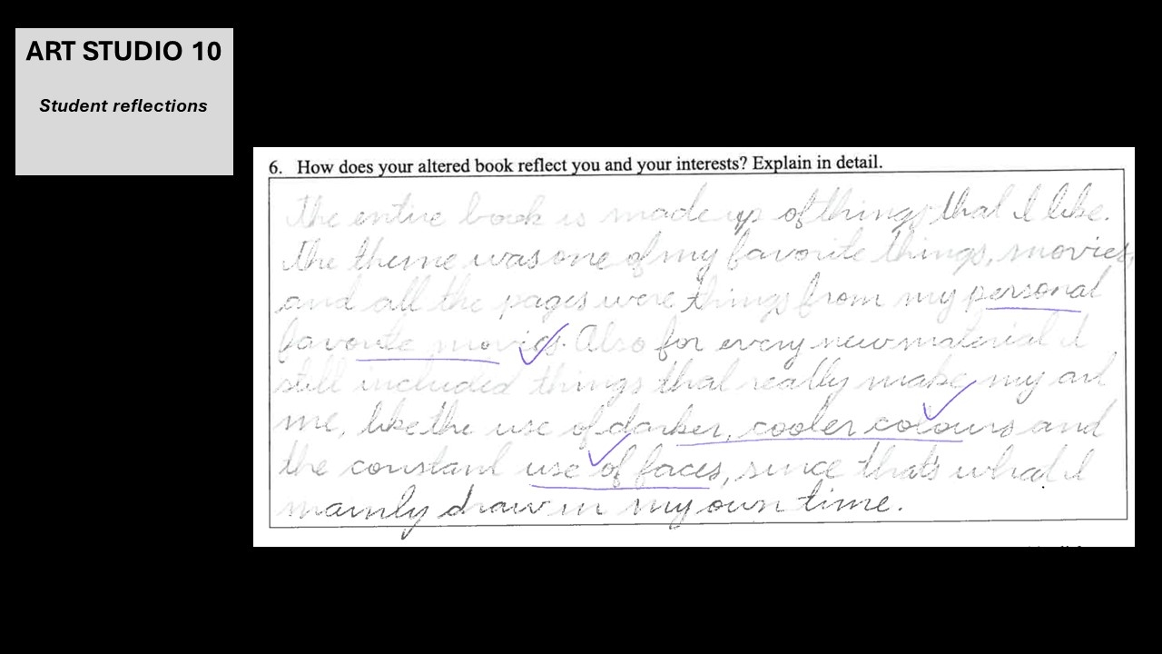 The Altered Book Project in Art Studio 10 encourages students to explore their identity, promoting self awareness and self management. Students create pieces that reflect themselves, their interests and their sense of belonging. The particular focus with these students has been demonstrating respect for self, others, and place. As evidenced in the art projects and reflections, students have taken personal risks. Through this process, we have a better understanding of who they are.