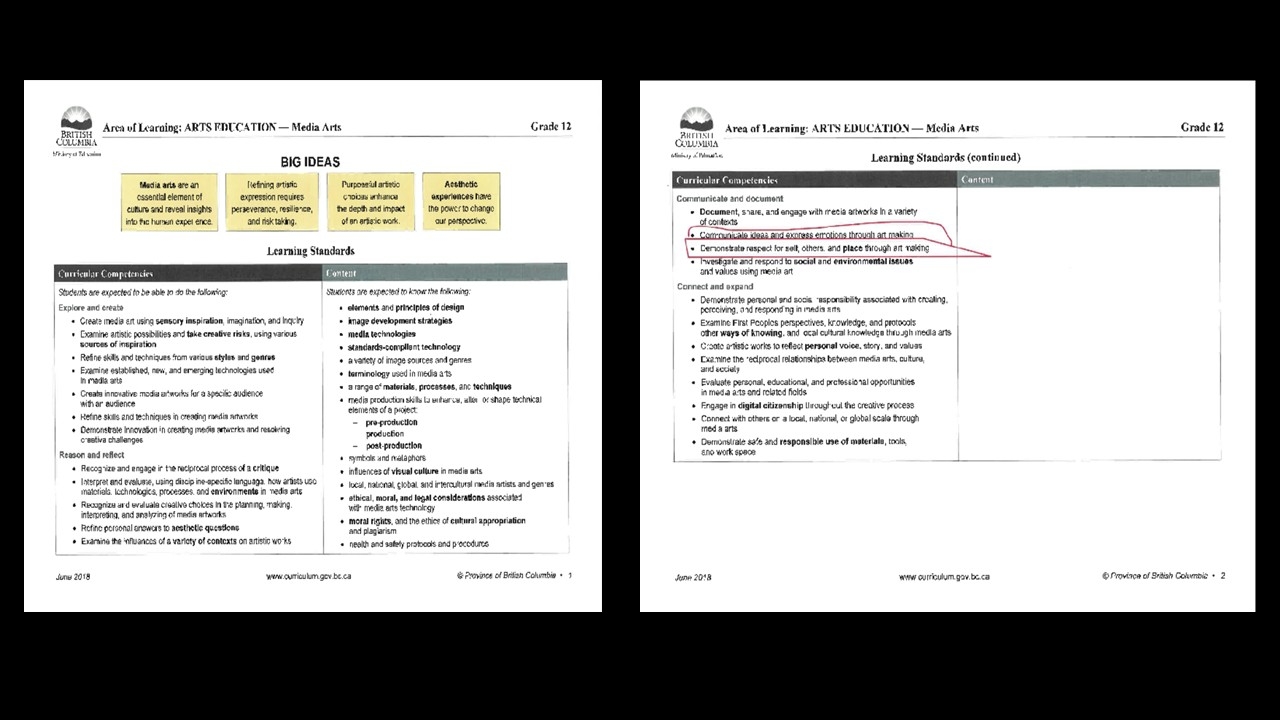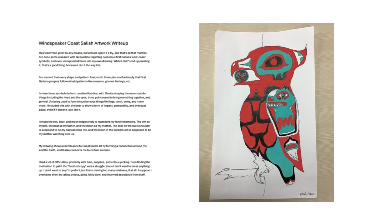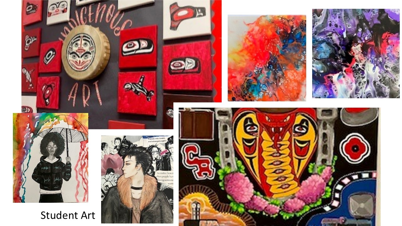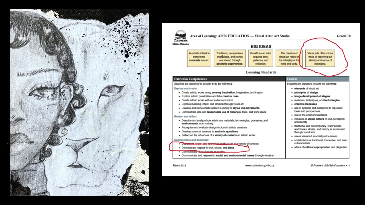 As our students have moved on in their educational journey this school year, we have been focusing on their social emotional learning (SEL) across the curriculum with a small group of grade 10 and 11 students. One area of focus has been their learning in Art Studio 10 & 12. One of the Big Ideas within Art Studio 10 is that "visual arts offer unique ways of exploring our identity and sense of belonging." One Big Idea in ART Studio 12 is "media arts are an essential element of culture and reveal insights into the human experience." Our particular focus has been around the curricular competency "demonstrate respect for self, others, and place." Place being "any environment, locality, or context with which people interact to learn, create memory, reflect on history, connect with culture, and establish identity." The connection between people and place is foundational to First Peoples perspectives on the world. Our focus is extended through student learning in the Career Life Education 10 curriculum, in particular the curricular competency, "communicate with the intent to highlight personal strengths, talents, accomplishments, and abilities."