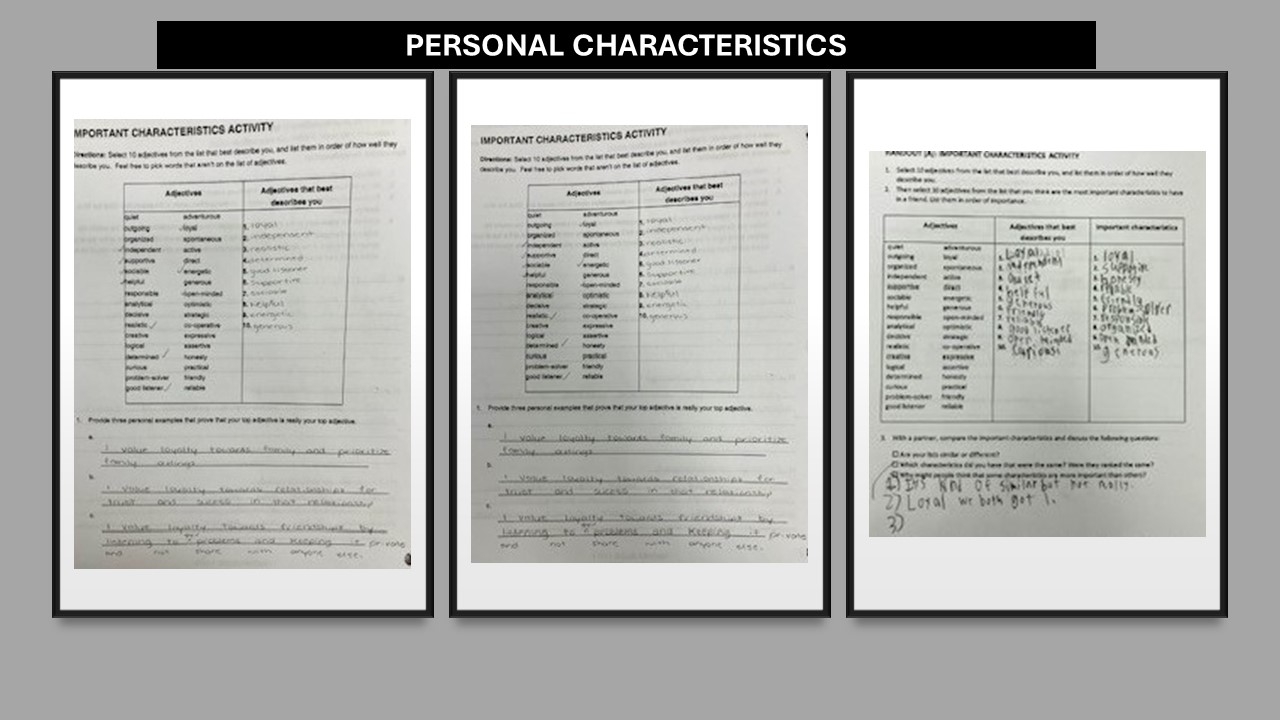 These processes begin student work in the areas of Self Awareness and Self Management.