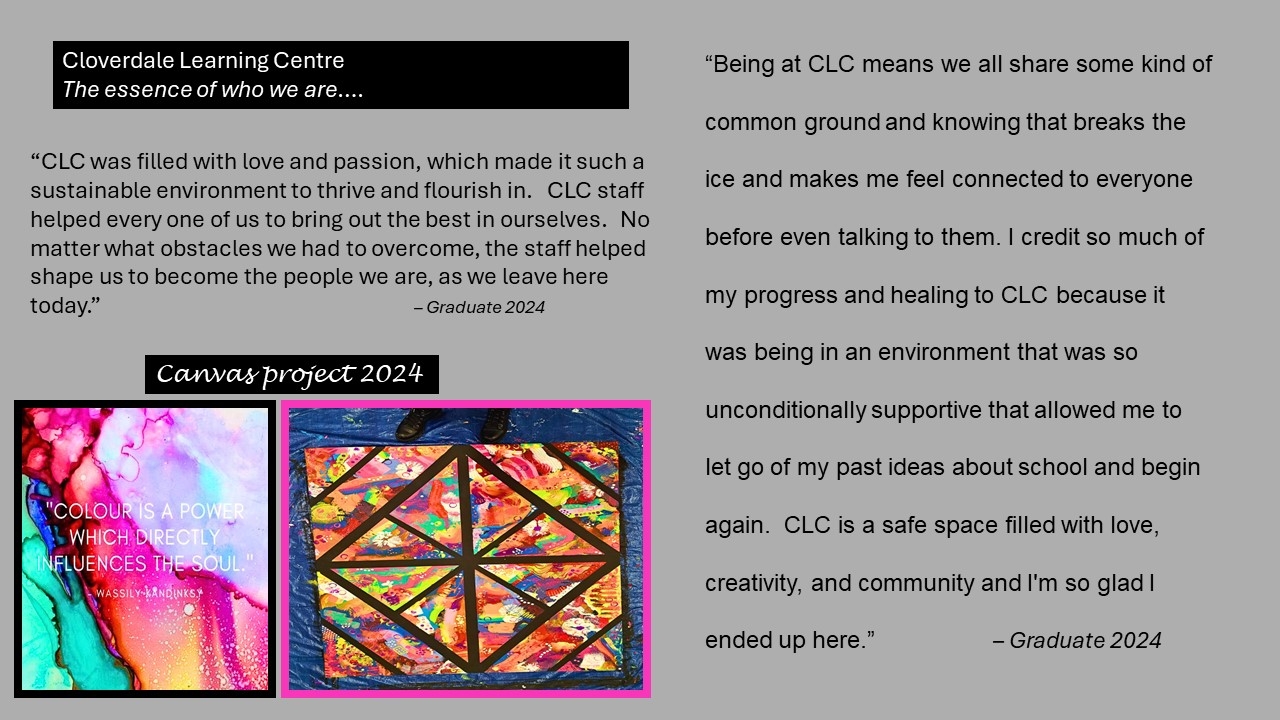 At the heart of a student's learning journey at the Cloverdale Learning Centre, is what they learn about themselves. Themselves as unique individuals that thrive and learn and grow, despite the barriers that occur along the way. The best part of this work is having the privilege to watch our students become their best selves.