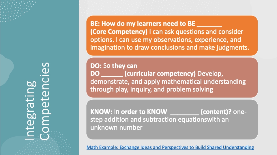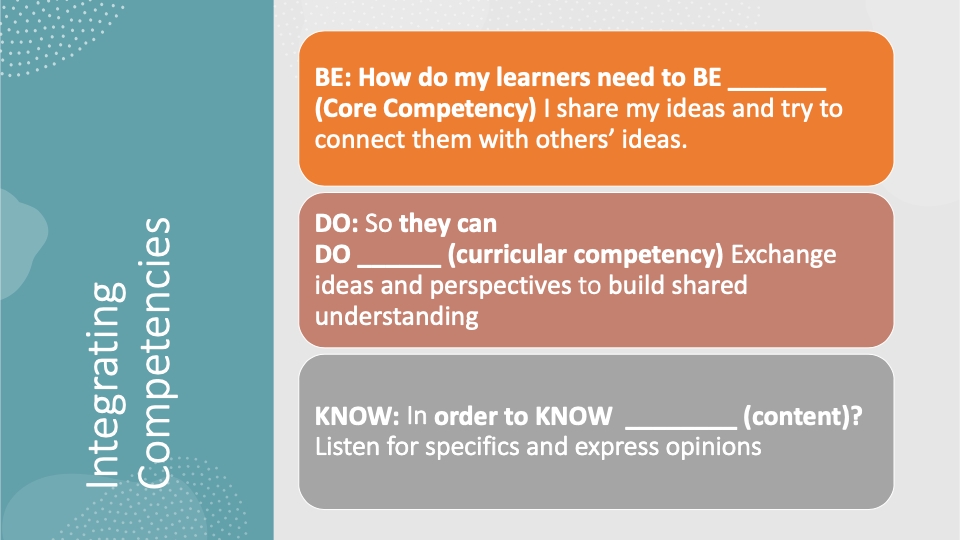 To support our student learning goals, teachers will continue to integrate SEL competencies with curricular competencies. At a learning lunch this year, one of our District helping teachers provided this framework to help teachers design their lessons: