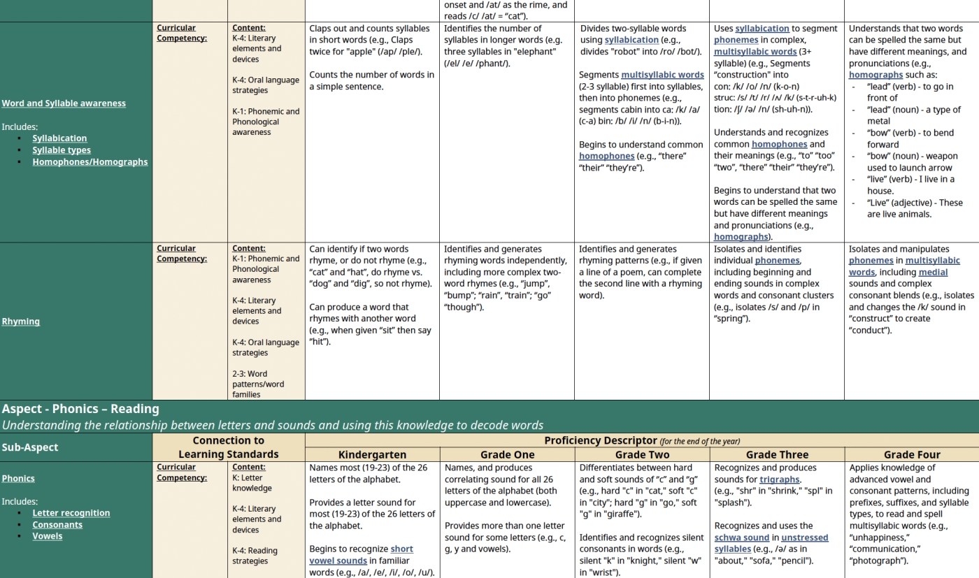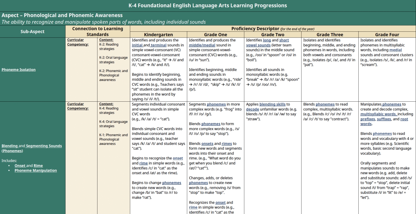 We are using the newly created K-4 Foundational English Language Arts Learning Progressions document as well as the English Language Arts Proficiency Profile document as reference points when structuring our lessons and tracking student progress. Below are some images of those documents.