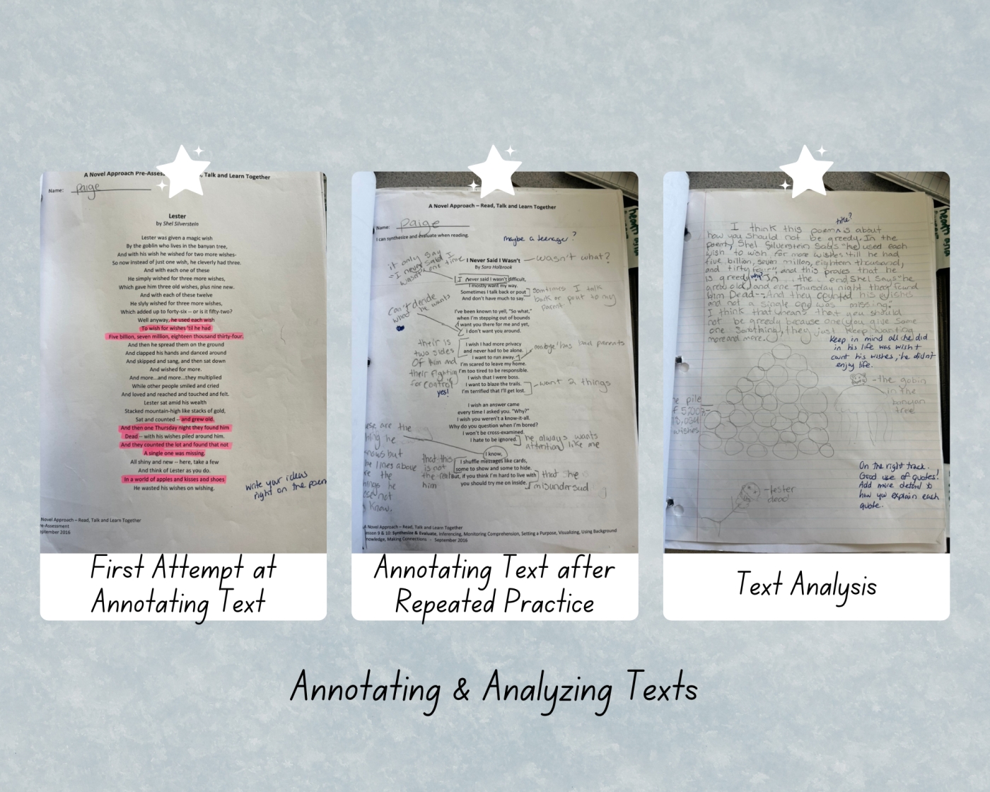 The first photo shows the first time a student annotated a text. You will notice that they were able to highlight important sections and words but were not yet able to write down their thinking. In the middle is a more recent example of text annotation, where the student is now able to really take note of their thinking. Ion the right is an example of analysis writing that is done once the text is annotated.