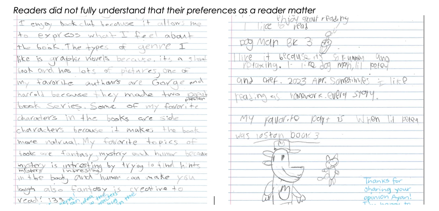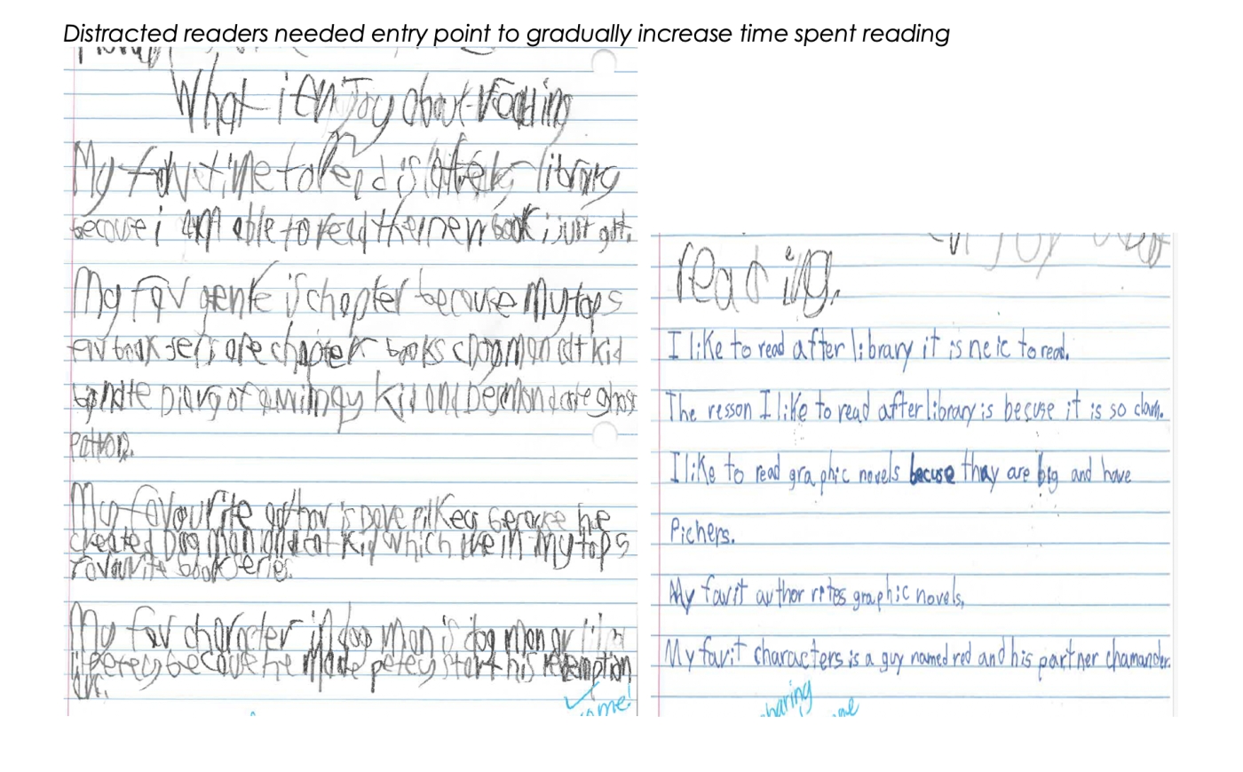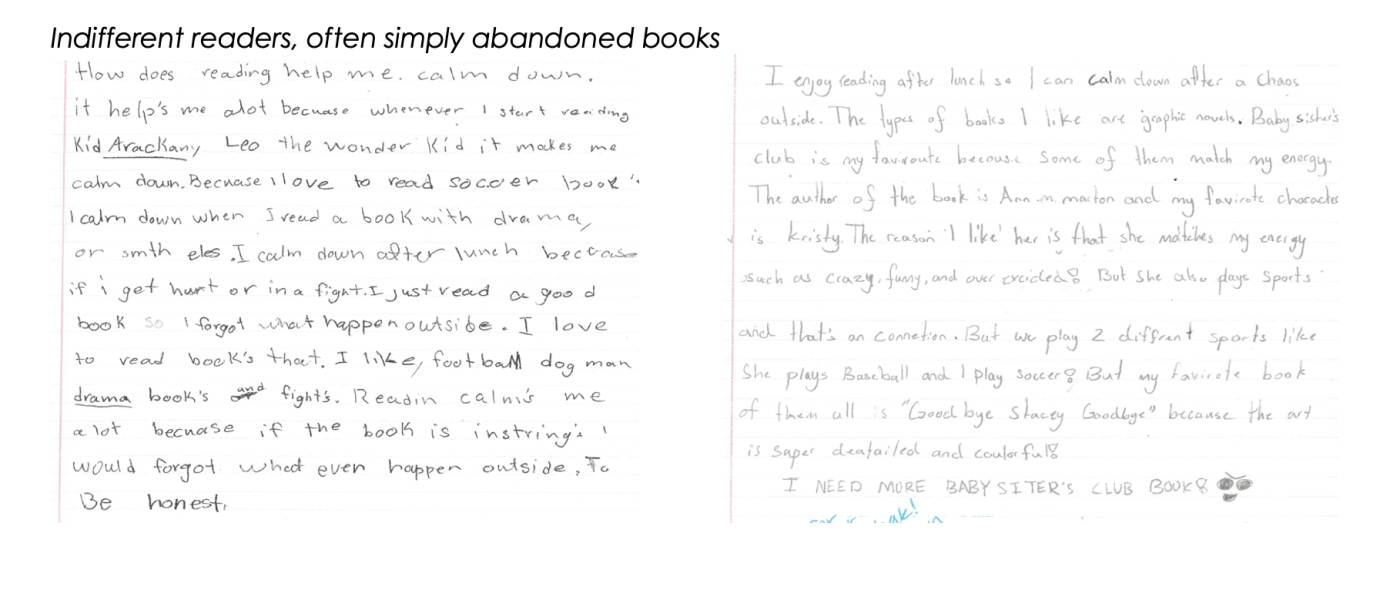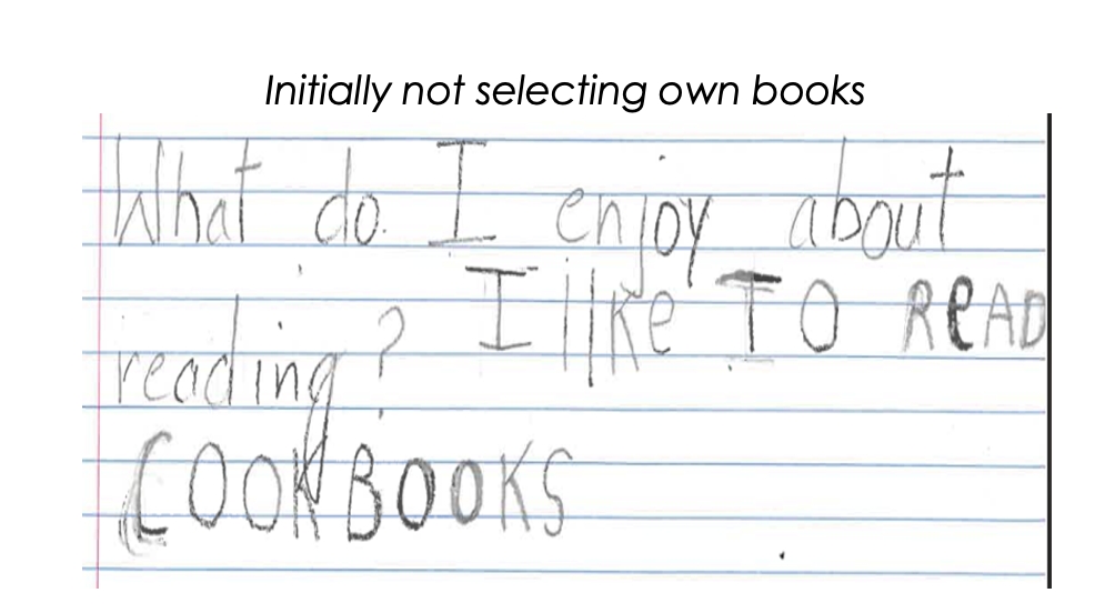 Readers recently shared what they find enjoyable about reading. They considered the opportunities for reading across they day, their preferences and dislikes. The selected reflections shared below represent readers who started the year stuck in a negative reading mindset in some way. Characteristics of that early year mindset are noted with their recent reflections.