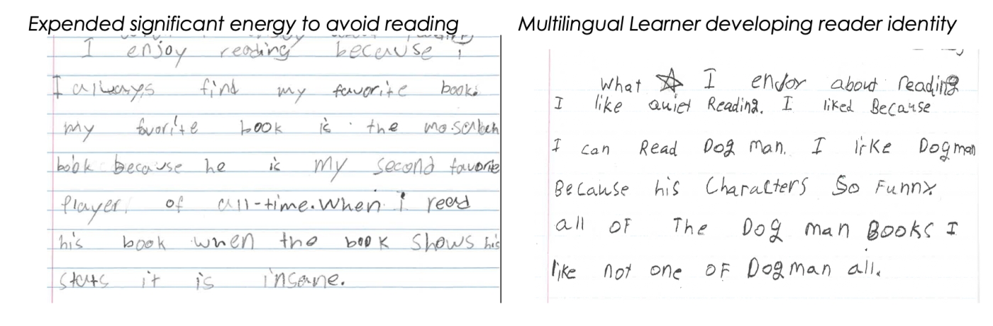 Our youngest learners practice decoding strategies to develop strong reading skills. The image on the left demonstrates using picture clues to build meaning. Using picture clues is an important beginning reading strategy for all learners, as Sumair describes, "I knew this word was 'robot' because on the left page it kind of looks like a robot. Also, I read this book a lot. Also, the first letter is'r' and that makes sense."