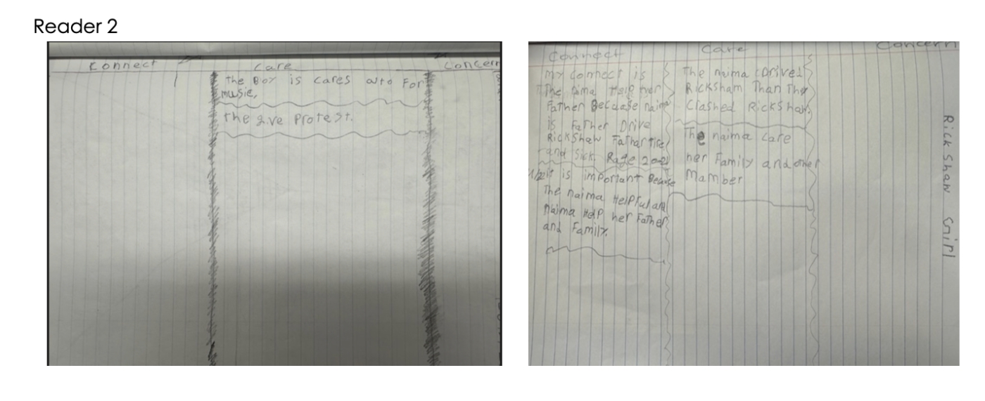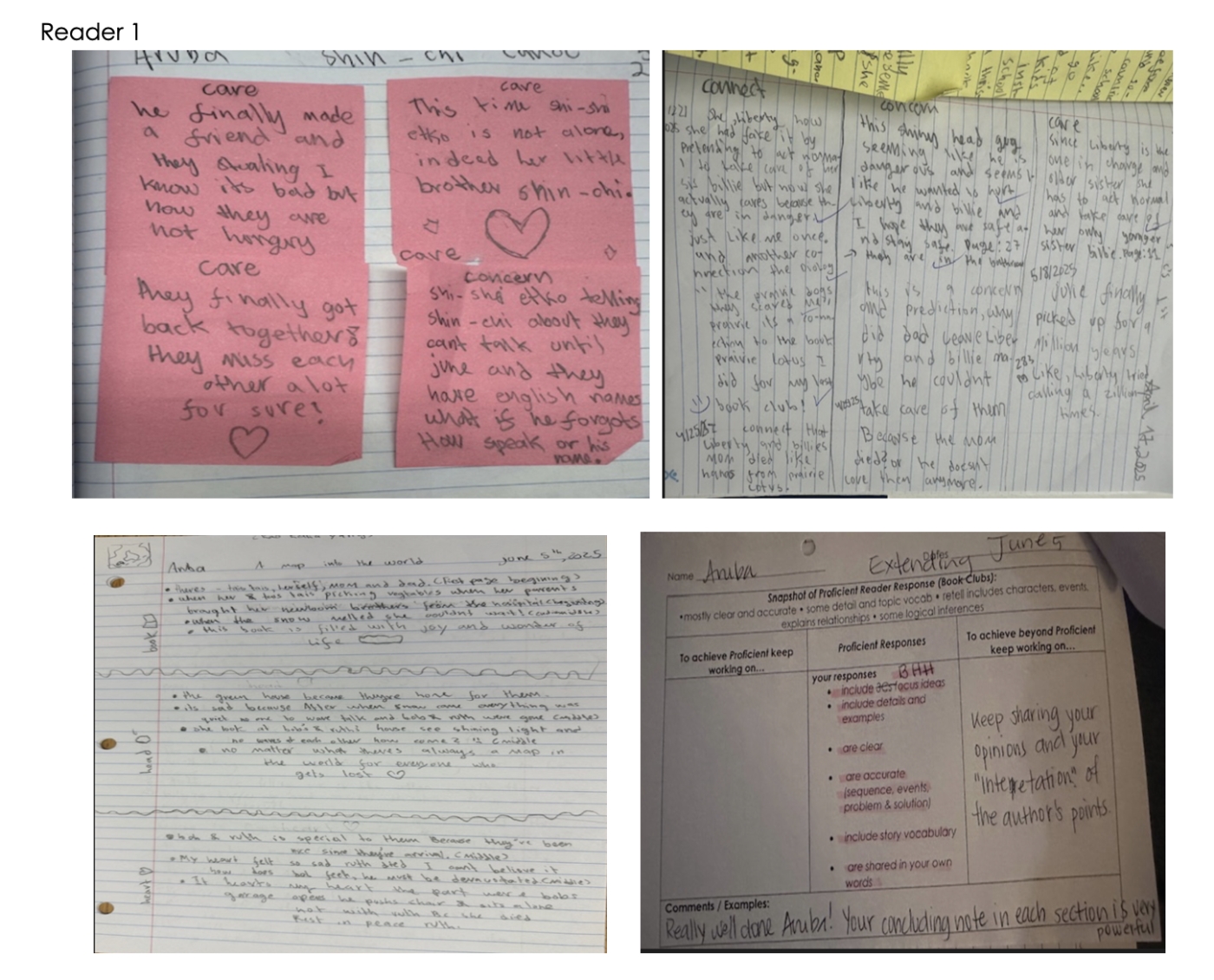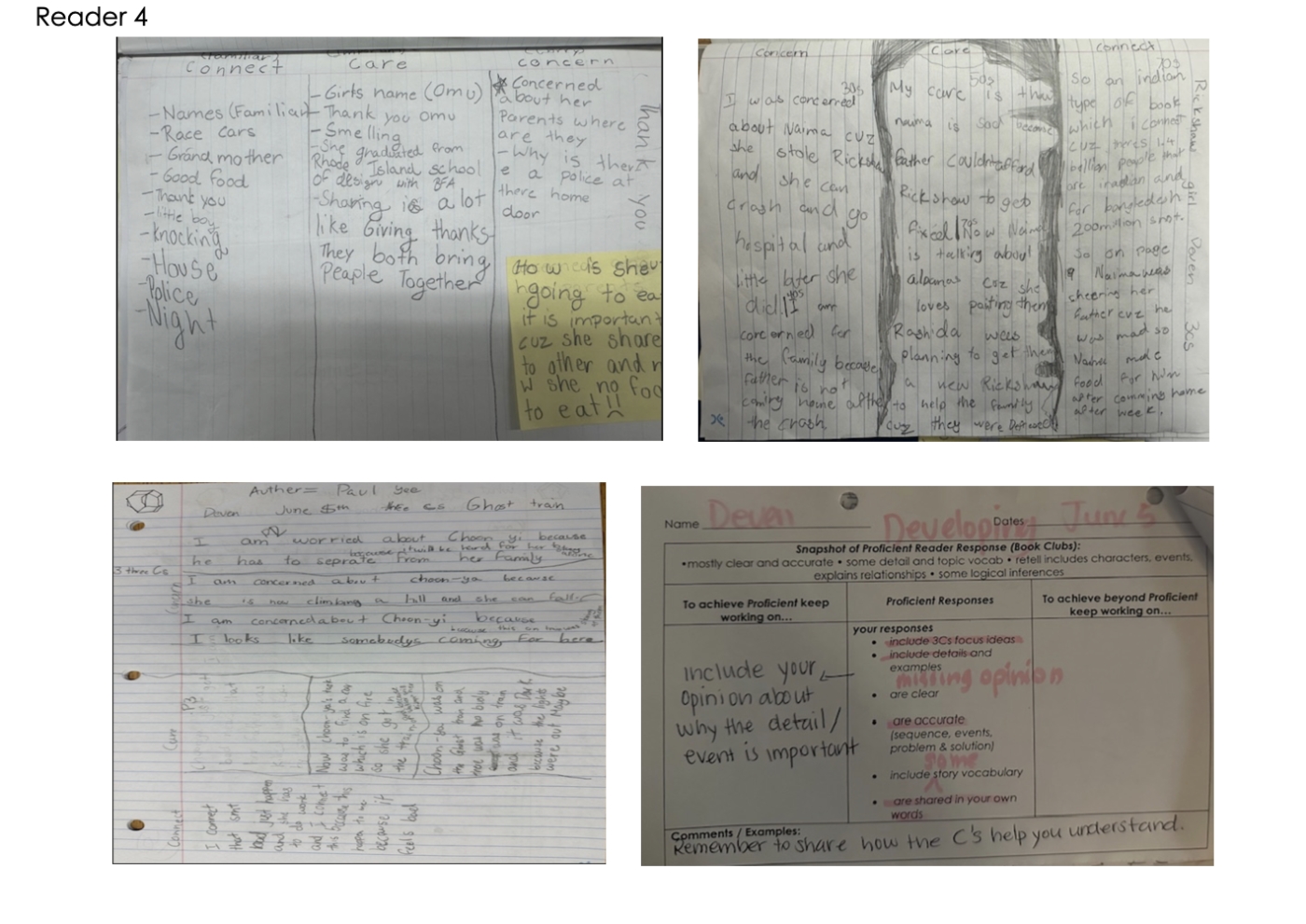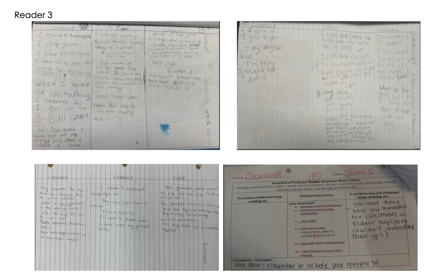 Goal 2: Reading Strategies: We Read StrategicallyReaders developed capacity to read strategically using a variety of thinking routines across contexts. 3Cs – My Cares, Connections and Concerns and Book, Head & Heart encourage readers to attend to important aspects of a fiction text while elevating their reader identity and interests. Notice & Wonder supports close reading of information texts while also highlighting the role of reader identity and interests in comprehension. All three routines build engagement and motivation by centering text relevance as readers consider what is important to them within a text that may or may not be self-selected. Reader voice is strengthened through the routines’ emphasis on sharing an opinion paired with reasons and specific text examples.