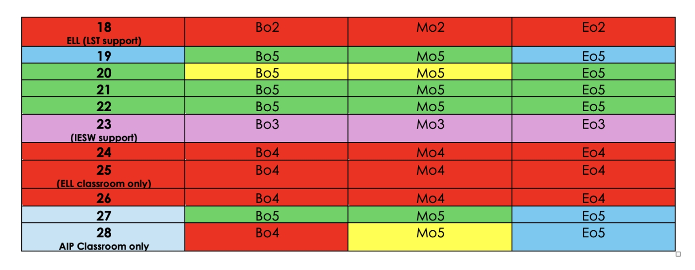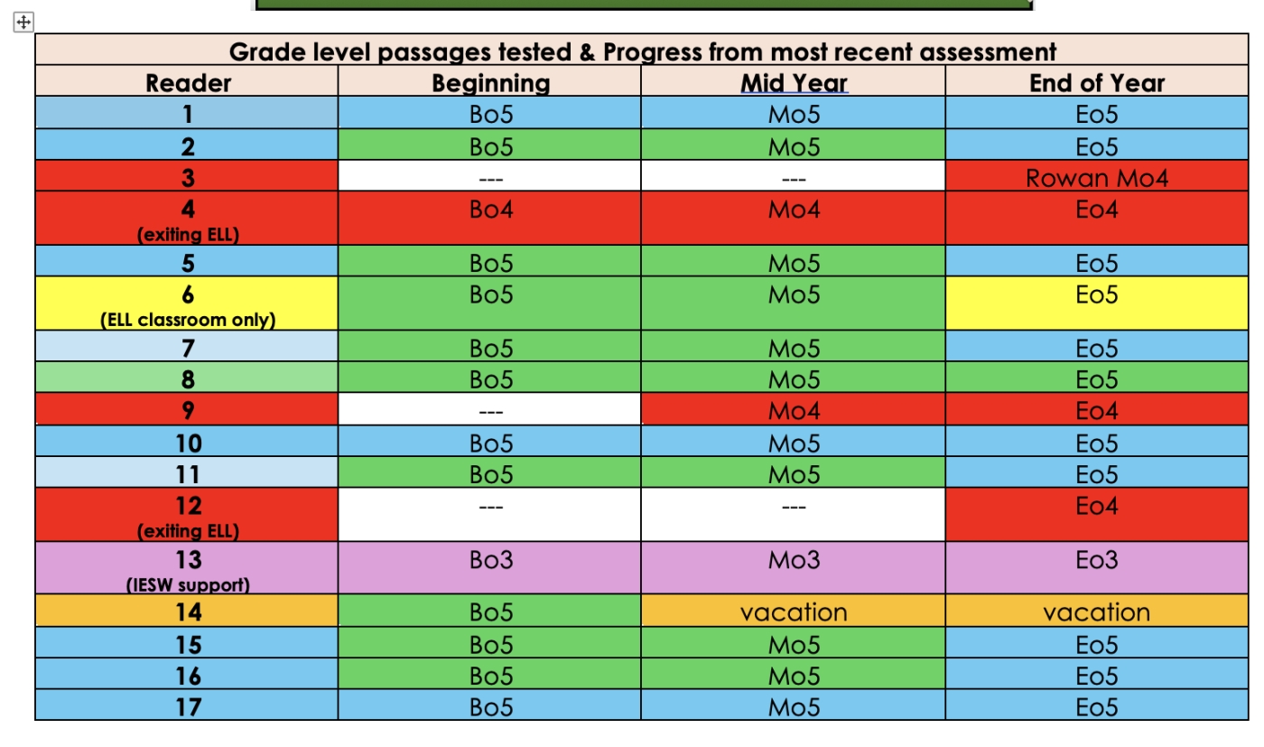 For the purpose of sharing, students reading below grade level, except for 2 readers with full times IESW support) are listed here in Red. While each of them made a year’s worth of growth, (maintained reading at that grade level, did not back slide) they are still not at grade level.