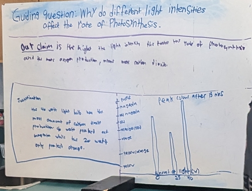 The purpose of this lab is to be able to apply the use of independent and dependent variables in their design of their procedure to test the affect of light on the rate of photosynthesis. Students use two different wattage bulbs and are given a way to block light (if they choose). Most students are able to identify the dependent and independent variables and with help can identify the control variable.