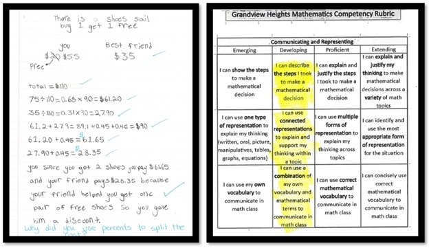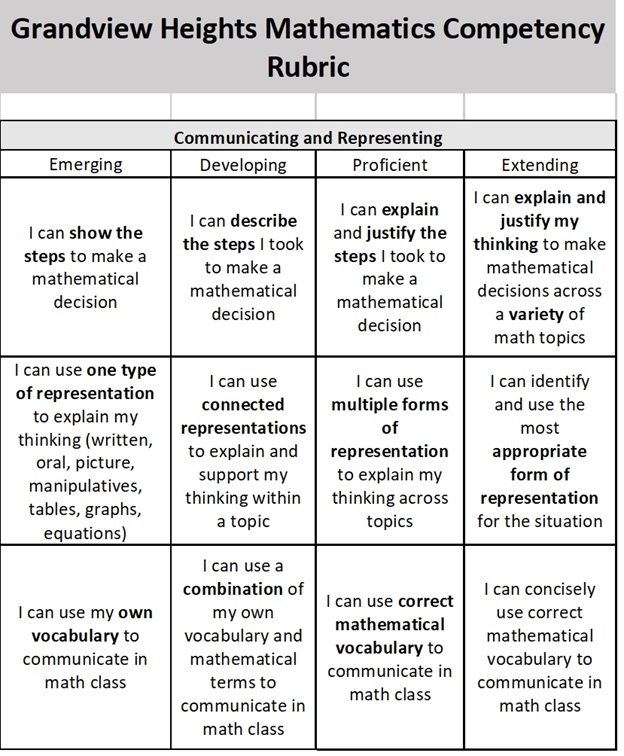 Our learners communicate everyday at Grandview Heights and to provide a way to capture this learning we created a competency rubric with a focus on communication to be able to understand where our learners are finding success and where there might be gaps in their learning. This allows teachers to focus their time in the classroom to help our learners to improve and become more proficient in communicating. Teachers use the rubric to asses student learning and students use the rubric to self asses their own skills. The "I can" statements in the rubric provide students with language they can understand and use, to know where they are at in their learning.