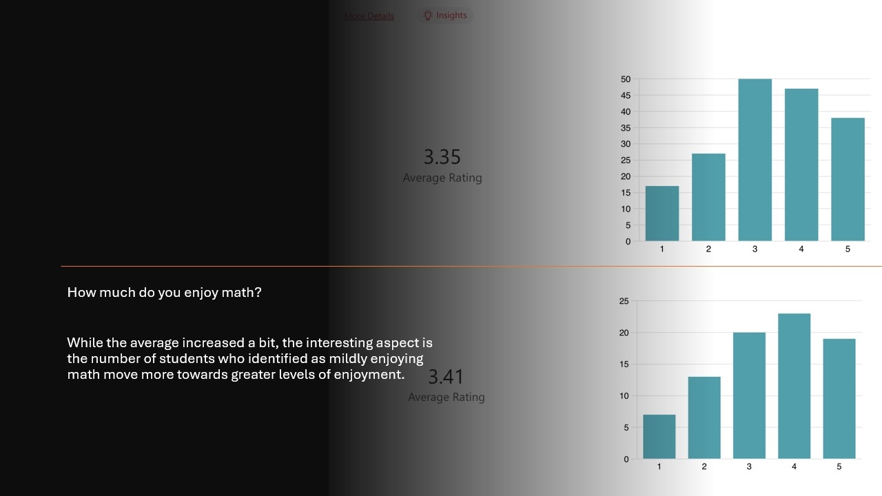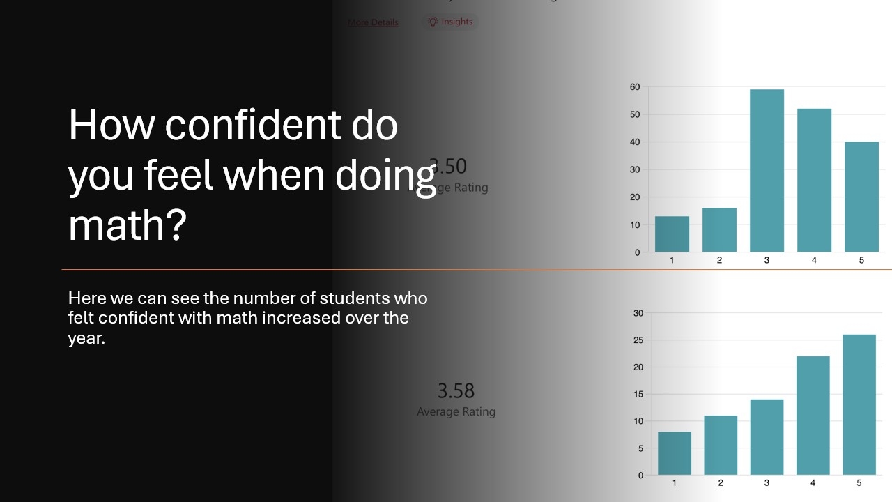 Overall, these multiple data points help us understand our students and inform us moving forward where to place our efforts. We would like to focus on students who do not feel comfortable or confident with math and feel they are struggling to move their skills forward while continuing to improve our student outcomes for all our students.