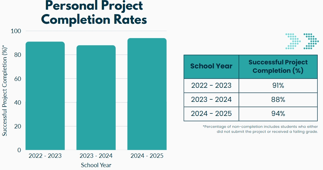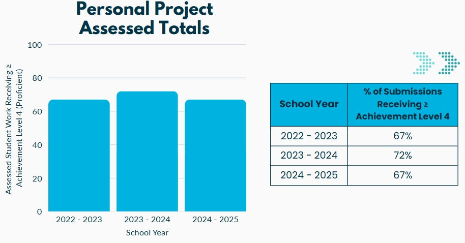 The 2024 - 2025 school year marked the highest percentage of successful student project submissions in the last five years (94%). However, there was a slight decrease in the percentage of students who received an assessed average achievement level of 4 or greater, returning to the 2022 - 2023 percentage of 67%. Thus, the goal moving forward remains to continue implementing practices and tools that will enable a wider variety of students to find success within the Personal Project.