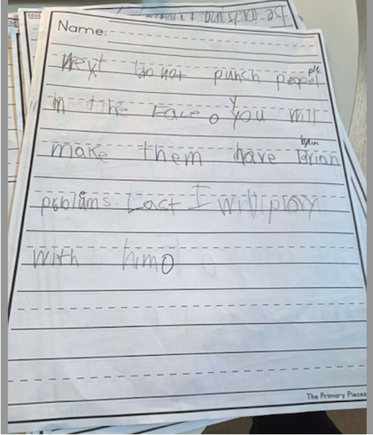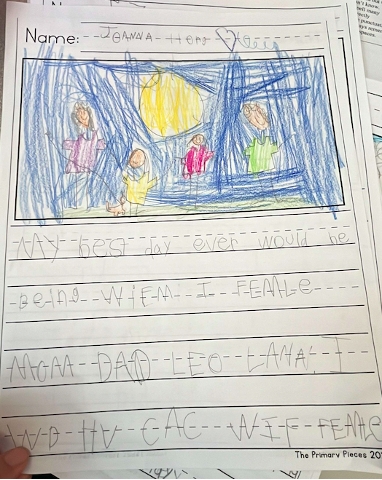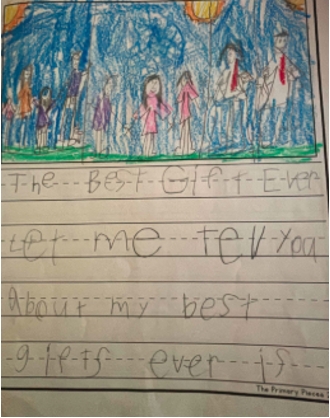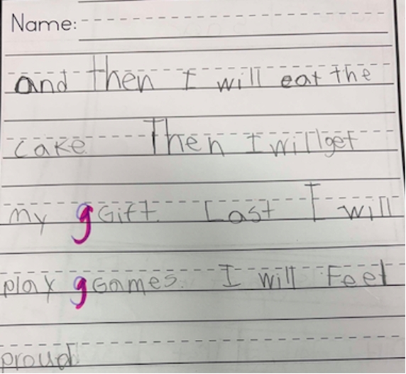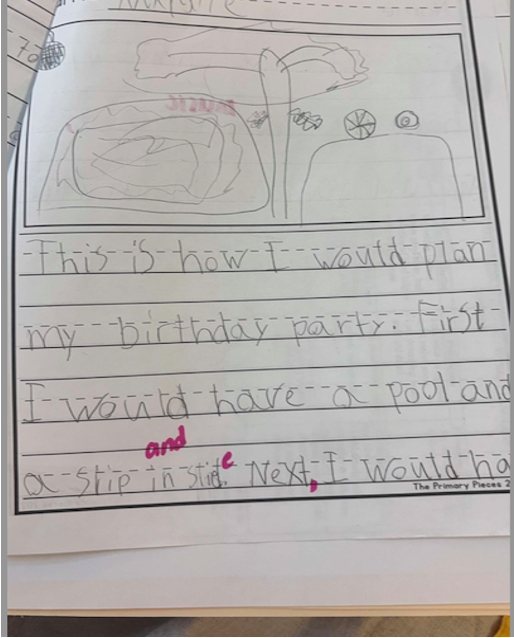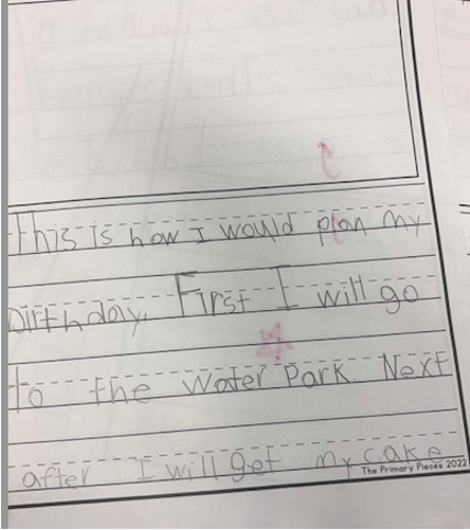 Writing was formally assessed through class-wide writes in September, November/December, March, and June. Topics included My Best Day Ever, My Best Gift Ever, Being a Good Friend, and A Perfect Birthday Party. September writing served as a baseline to track growth and guide instruction. Results showed a need for daily writing routines and a structured, explicit approach to phonics.