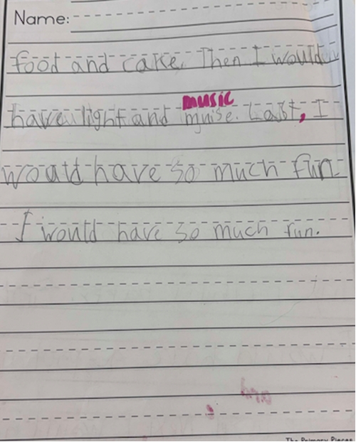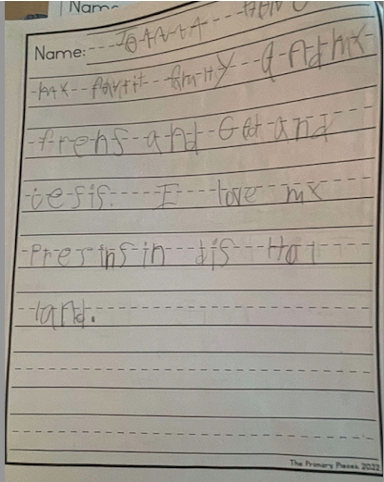 By mid-year (December and March), she was assessed as developing. Her writing showed progress in phonetic spelling and more accurate use of uppercase and lowercase letters. Through consistent phonics instruction (UFLI) and daily writing practice, Student A made steady gains in her spelling and writing skills.