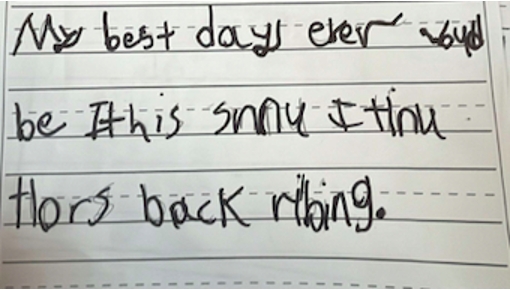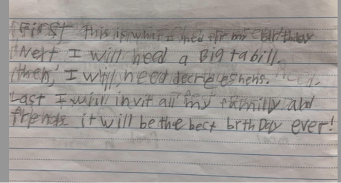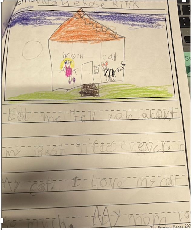 By the end of the year, her writing was assessed as proficient. She is now able to independently write about a single idea with supporting details, use complete sentences, and apply correct capitalization and punctuation in most cases.