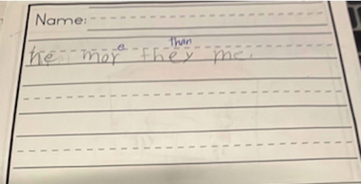 The data reflects significant improvement in writing among most students in this Grade 1/2 class. This growth can be attributed to the implementation of a structured, systematic phonics approach. Students engaged in daily UFLI lessons, along with regular grammar and writing instruction. Daily writing opportunities supported the development of their written expression and foundational skills.