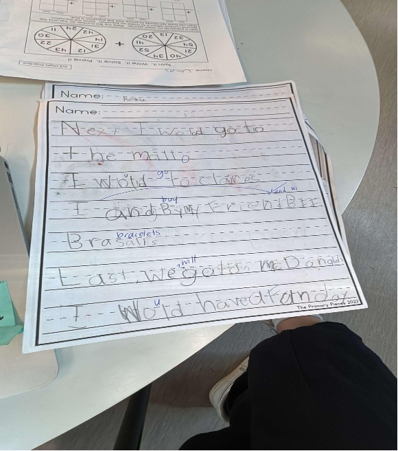 Student B’s beginning-of-year writing highlighted gaps in phonics knowledge. She was able to express only one idea and had difficulty expanding her thoughts. By November, her writing was assessed as developing, as she struggled to consistently write complete sentences.