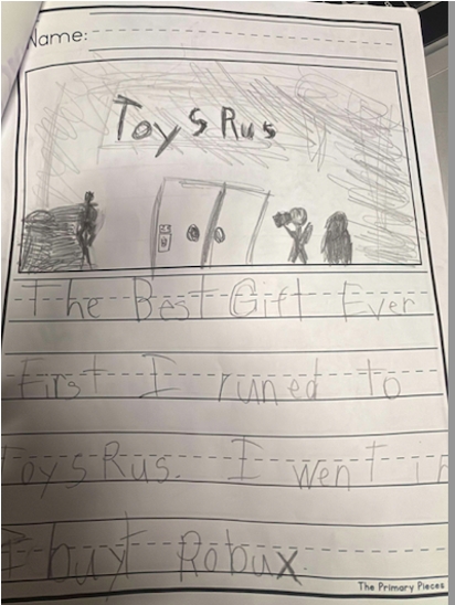 Student D’s September writing showed limited ideas and some accurate spelling, indicating a need to strengthen his phonics knowledge. He was able to write complete sentences but often omitted proper punctuation.
