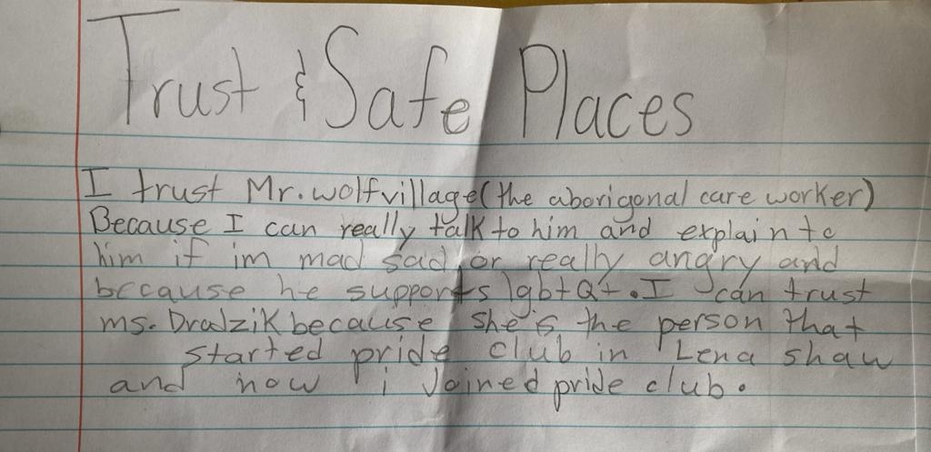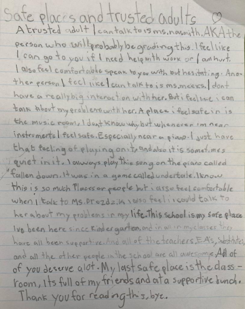 Through Journal writing 75% of our grade 4 and 5’s will can 8/10 will be able to identify SEL through journal writing will be able to identify a trusted adult.
