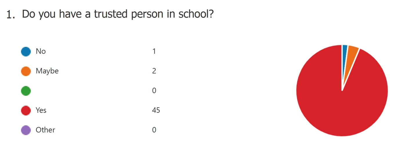 The results from the survey indicated that majority of students have a trusted adult in the school they can talk to. These adults provide either a safe place, support for students when required, a place where they can seek help with problem solving or advice. Based on our initial data, we can see these are areas to be celebrated.
