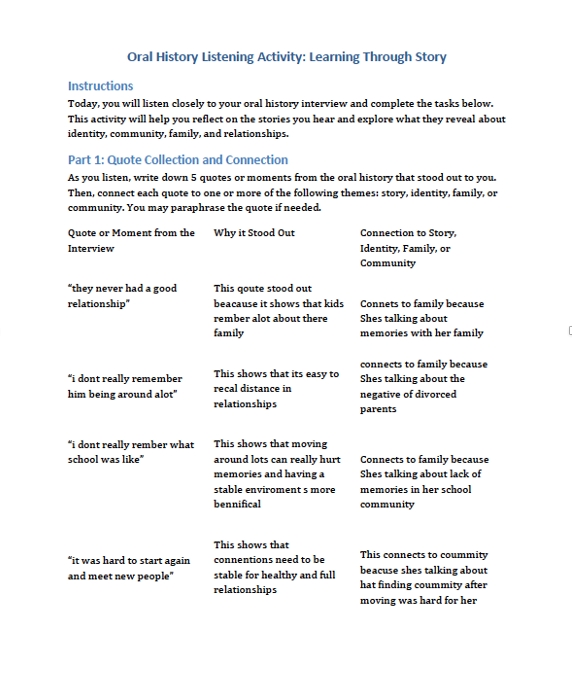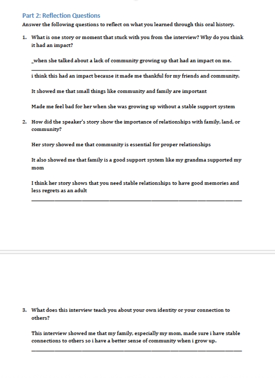 2) Grade 8 students were also asked to interview a family member about their lives and reflect on factors that impact their own identity. Students' understanding of the factors influencing their identity was demonstrated and assessed through their written reflections.