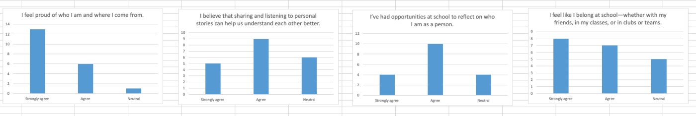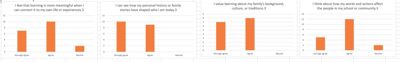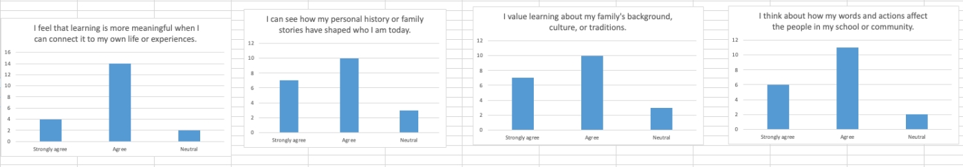 As noted above in the graph, the students progressed in recognizing personal, social and cultural contexts, values and perspectives in text through the exploration of their own identity. There was a 5% increase in the number of students “Strongly Agreeing” with factors that influence their identity, and with this, developing a deeper understanding of themselves..