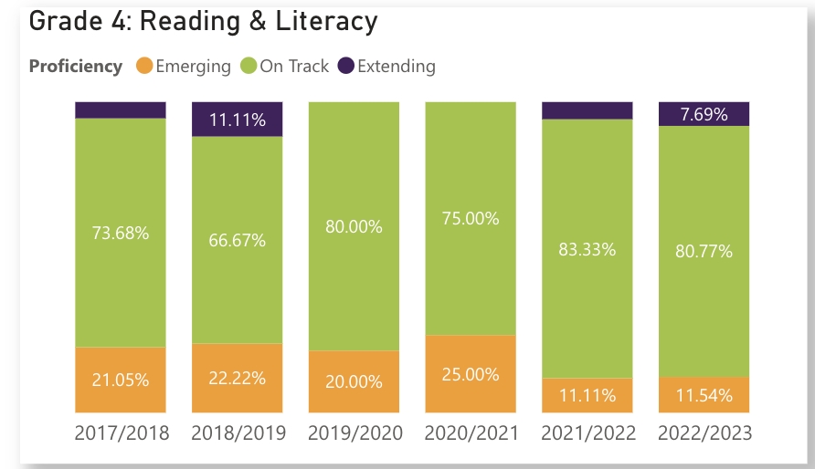 In the graph below, you can see that in grade 4, the number of students marked ‘emerging’ in literacy has gone down in the last two years. We can also see that there are more students who have achieved “extending” in literacy. These are positive trends that we want to see continue.