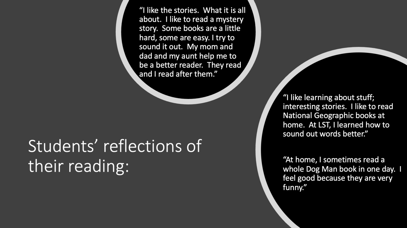 All students said that they enjoy reading. They said that is used to be hard for them but that it is now getting easier. It is interesting to note that all of the students interviewed talked about reading at home with their family. It was wonderful to see how families are spending time at home reading together!