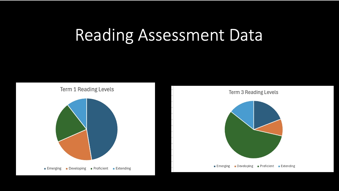 This first set of data shows the reading assessment results for the whole cohort of learners. There was improvement in the reading levels of every student. Although some students are still at the emerging level, they have all improved by two levels or more.