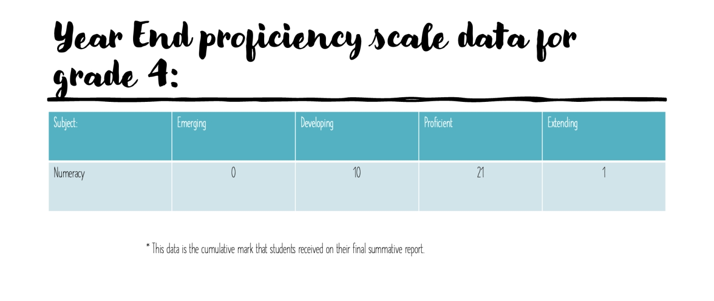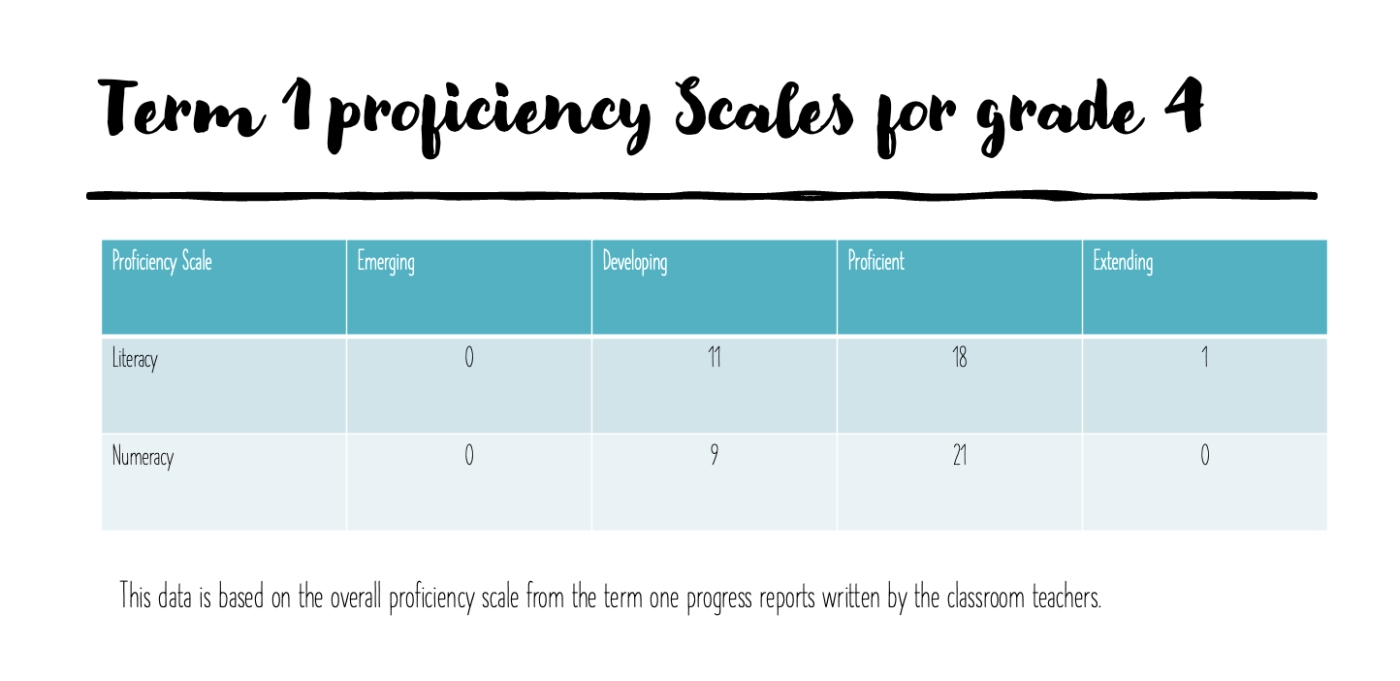 In their term one reports, there were no grade 4 students who were emerging in numeracy. A number of students were still at the developing level while the majority of the students were at the proficient level. There were no students who were reported to be extending in their numeracy skills.