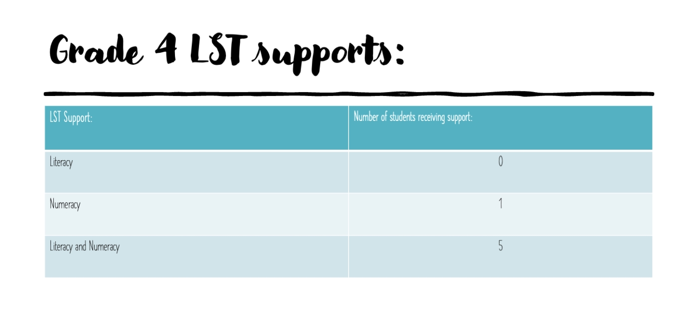 On this chart, you can see that one student in grade 4 is receiving extra support for numeracy only while five student are receiving support for both literacy and numeracy.