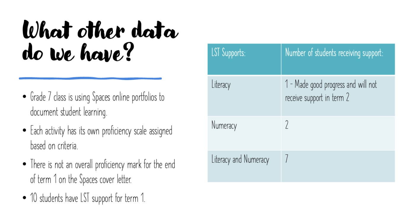 To effectively track student progress in mathematics over time, we will utilize a multi-faceted approach that combines classroom teacher assessments, proficiency scale data from student reports, and information on students receiving targeted numeracy support. Classroom teachers will conduct regular formative and summative assessments aligned with curriculum standards, providing ongoing insights into individual student understanding and skill development. These results will be complemented by proficiency scale data from formal reporting periods, offering a standardized measure of student achievement across key mathematical domains. Additionally, we will monitor the number of students receiving specialized numeracy support, which will help identify trends in learning needs and the impact of interventions. Together, these data sources will enable us to build a comprehensive picture of student growth, inform instructional planning, and ensure timely support for those requiring additional help.