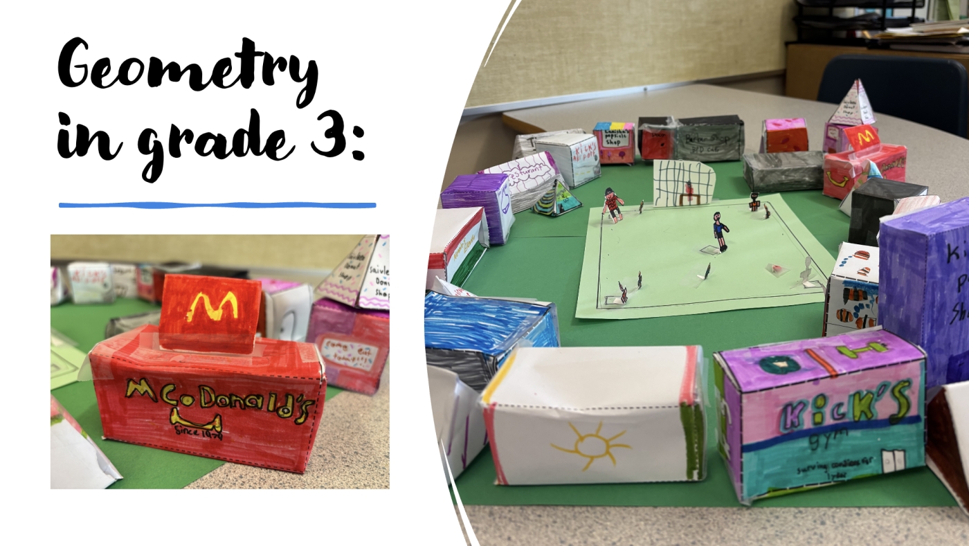 Mrs. W explains "the students were able to explore their creativity by combining math and art. Students were creating buildings based on their "net" shape."