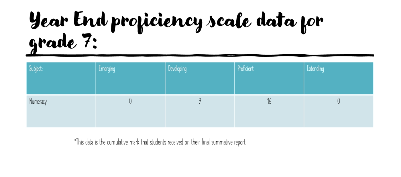 From the data above, we can see that most students are proficient in numeracy with many students falling into the developing category. No one in grade seven received an emerging mark or an extending mark.