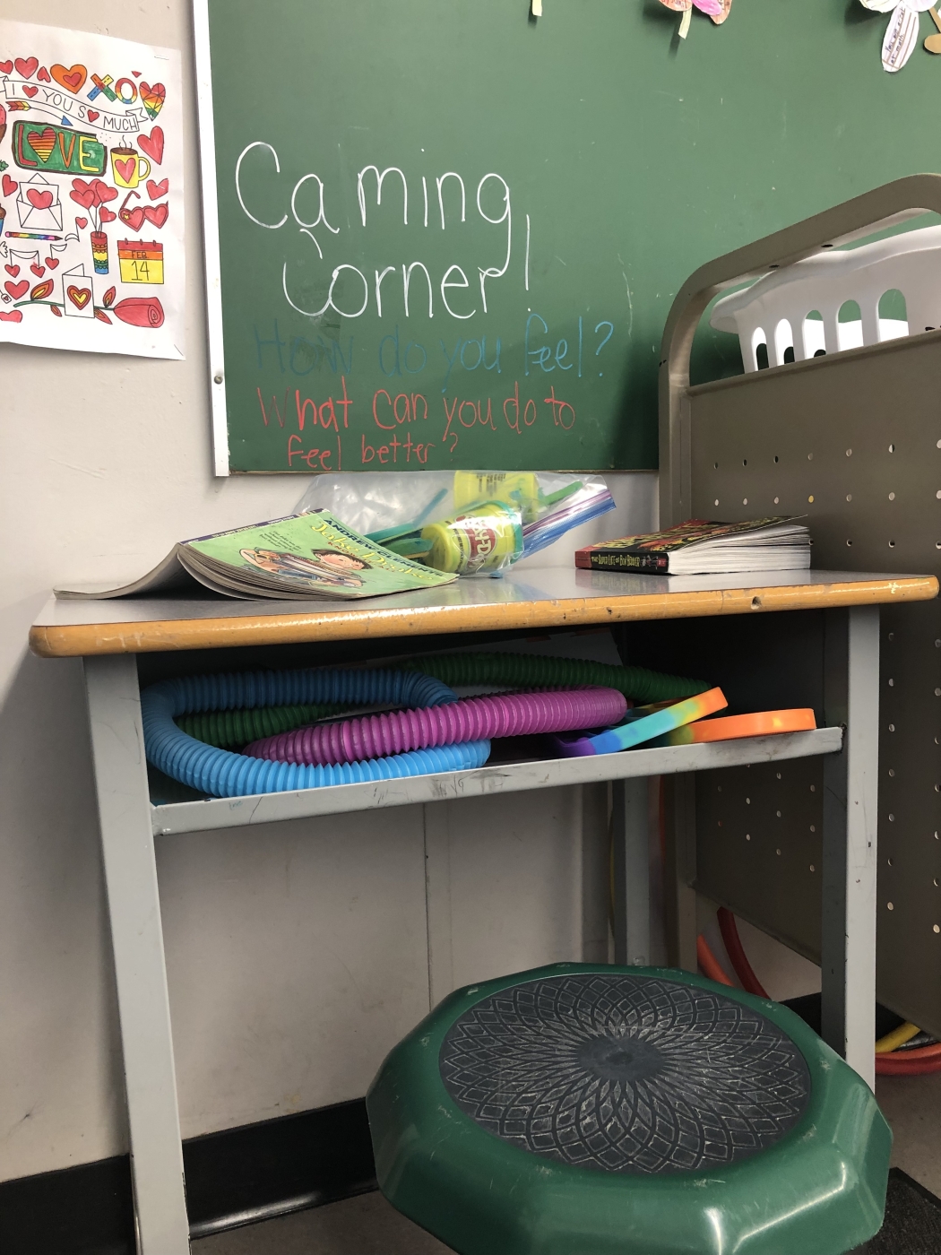 In the picture below, you can see a “Calm Down Corner”. This is an important space in the classroom that students can access when they identify that they are in need of strategies that can help create feelings of comfort and calm. When a student arrives, the prompts on the board ask the learner: “How do you feel? What can you do to feel better?” If you look closely at the picture below, you can see a variety of tools and supports that the student can then access: favourite books, playdough, sensory tools, and a stool that allows for movement.