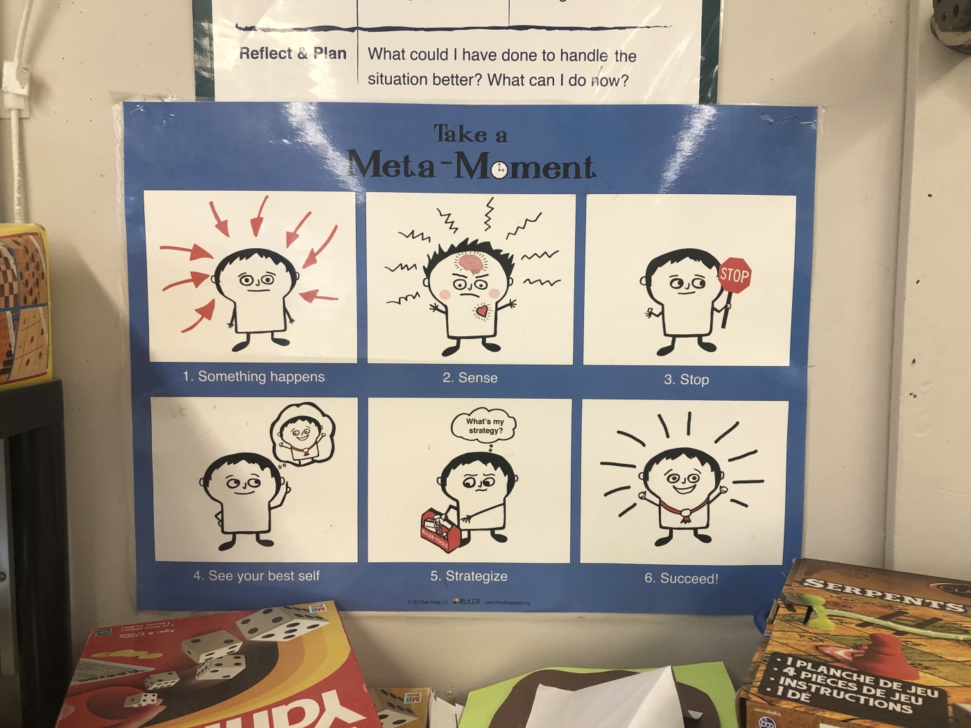 The Meta Moment allows a learner to step back from a situation so that they may pause and think before acting. We ask ourselves, how would my “best self” react in this situation? What strategy can I use so that my actions reflect my best self? This allows students to gradually replace ineffective responses with safe, empowering responses.
