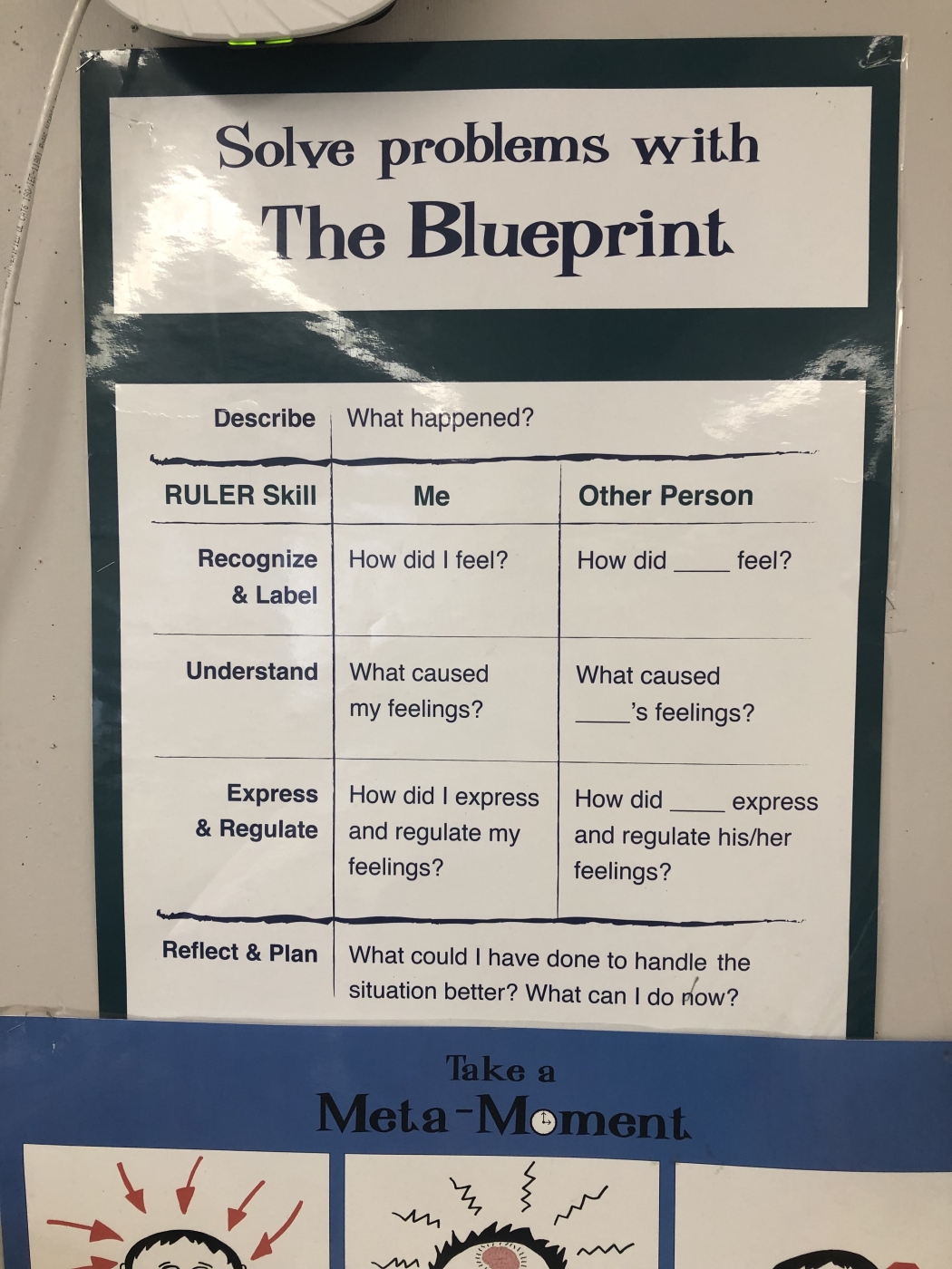 Teachers engage students in the Curricular Competencies to teach the skills that develop emotional literacy within the classroom community throughout the year. This is through a variety of strategies such as written reflection, or possibly explicit lessons on perspective taking such as those provided by the Second Step or RULER program. Two commonly taught strategies in the school are the Meta Moment and The Blueprint from the RULER program.
