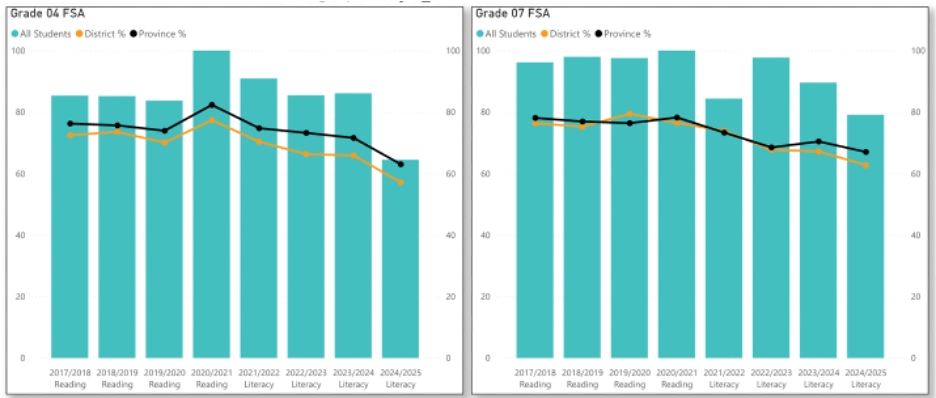 FSA data indicates a more pronounced decline in Grade 4 performance since 2019–2020, likely due to pandemic-related disruptions. In contrast, Grade 7 students have maintained their literacy skills more consistently. The gap between school and district/provincial averages is more evident in Grade 4, underscoring the need for targeted early literacy interventions—an observation that aligns with classroom experiences.