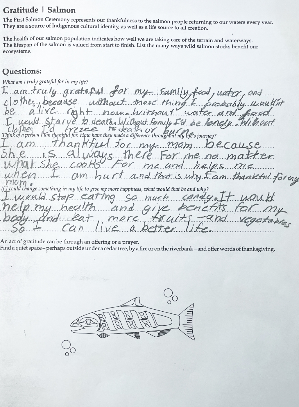 Our Intermediate students have shown how they can "respond to text in personal and creative ways" through reading, listening and viewing. This process reflects the BC curricular competency to Comprehend and Connect. The following example teaches about gratitude for salmon as a source of Indigenous cultural identity. Students responded by connecting to the First Salmon Ceremony and describing what they are grateful for in their lives.