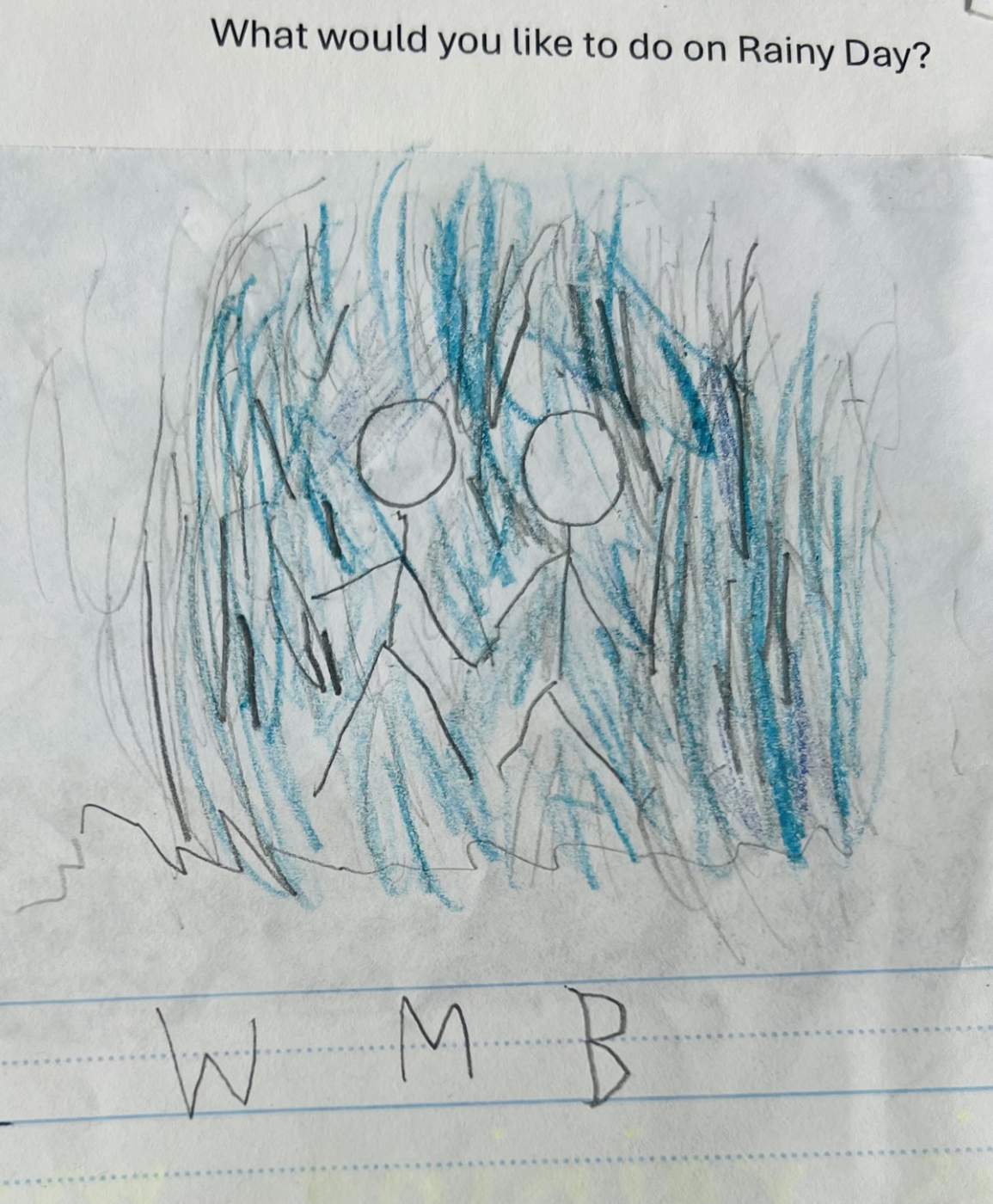The first journal entry was completed in Term 1. Here the student is able to sound out and write the first letter of the words in the sentence. W for "wear" M for "my" and B for "boots." In the second entry, the student is able to add more details to their writing. We can see that the student understands each word is separated with a space and is able to blend letter sounds to create more complete and accurate words.
