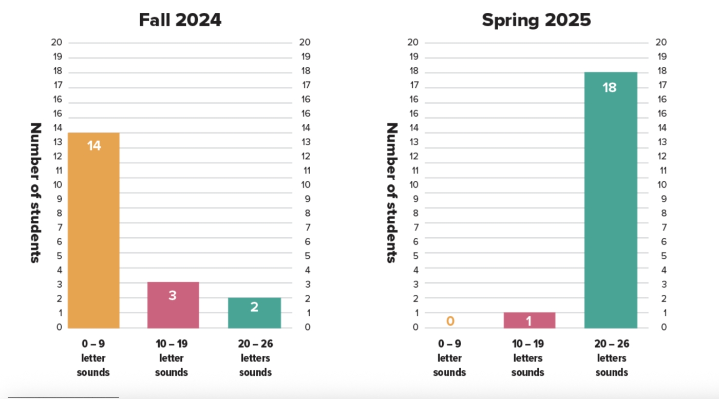 The chart below shows student growth in identifying letter sounds. In fall, 2 students could identify 20-26 letter sounds. In spring, that number jumped to 18.