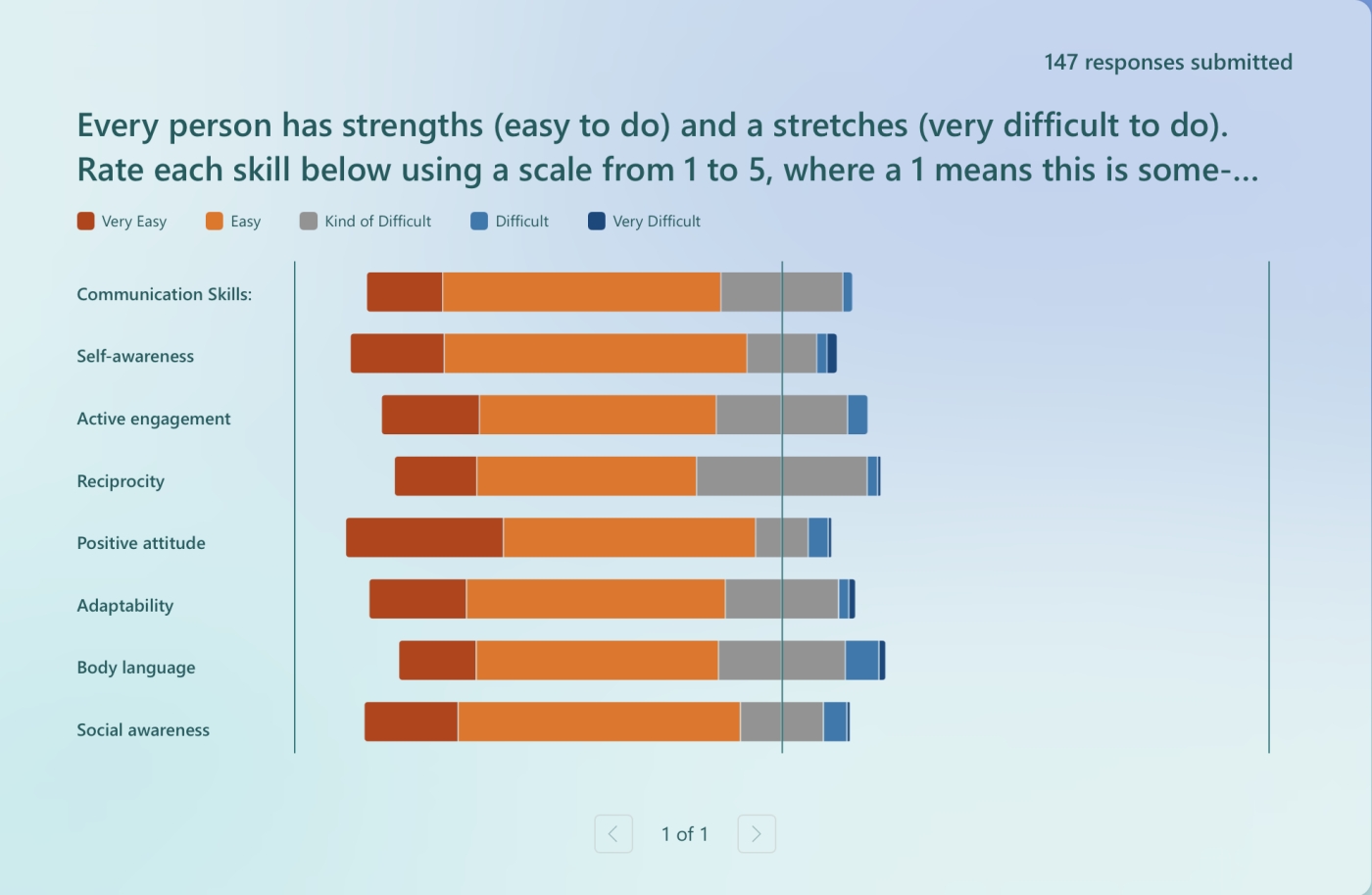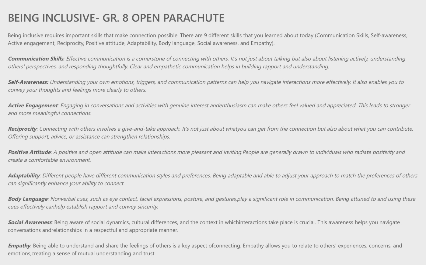 In line with this year’s focus on strengthening communication skills we worked with the grade 8s to enhance their ability to articulate their ideas, perspectives, and viewpoints thoughtfully in various formats. By using a program titled "Open Parachute" we worked with our grade 8 students to foster an inclusive mindset and inspire collaborative, reflective, and engaged learners. The following are the terms students learned, questions asked regarding their strengths and their stretches and their responses:
