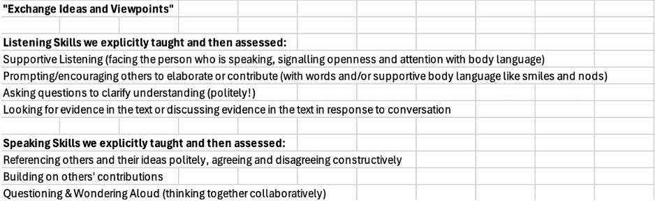 Language from the provincial assessment scales was used to identify successes and remaining challenges. There was a noted improvement for most students identified in the sample group of 71 students in relation to the goal of exchanging ideas and perspectives to develop shared understanding.